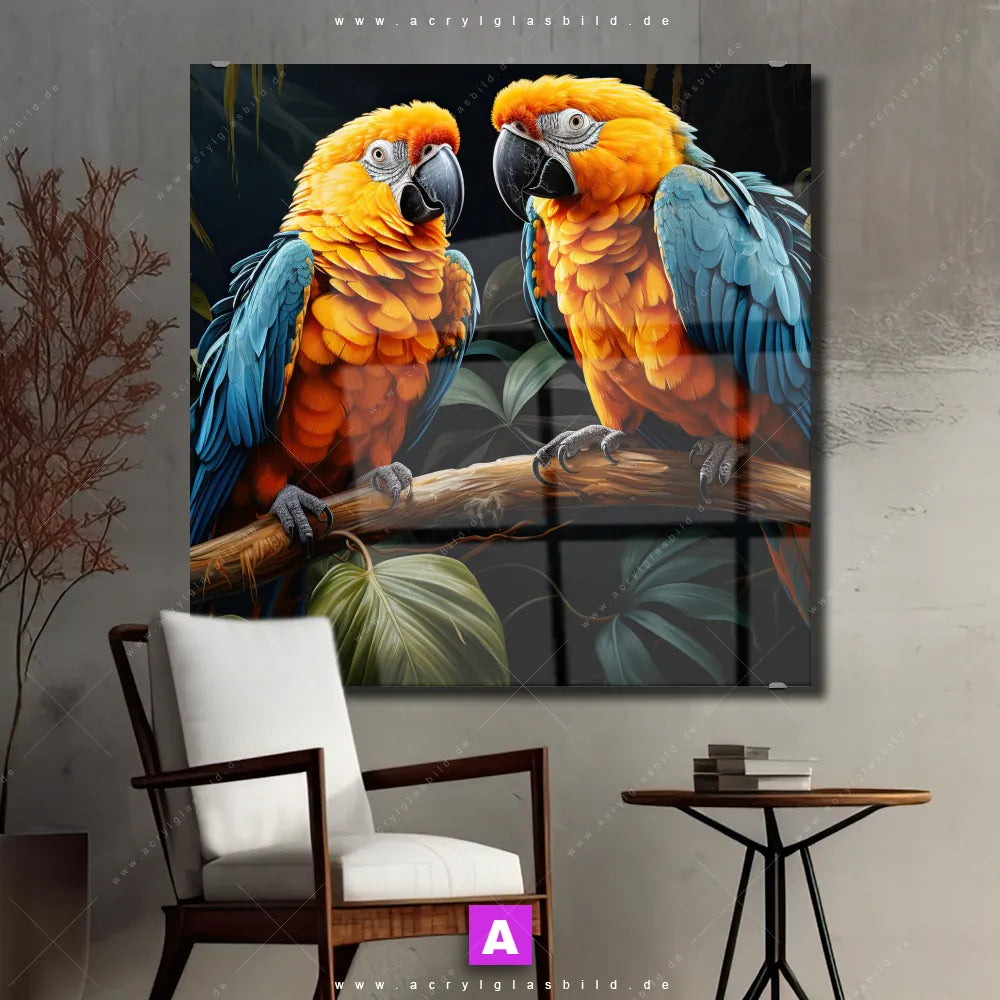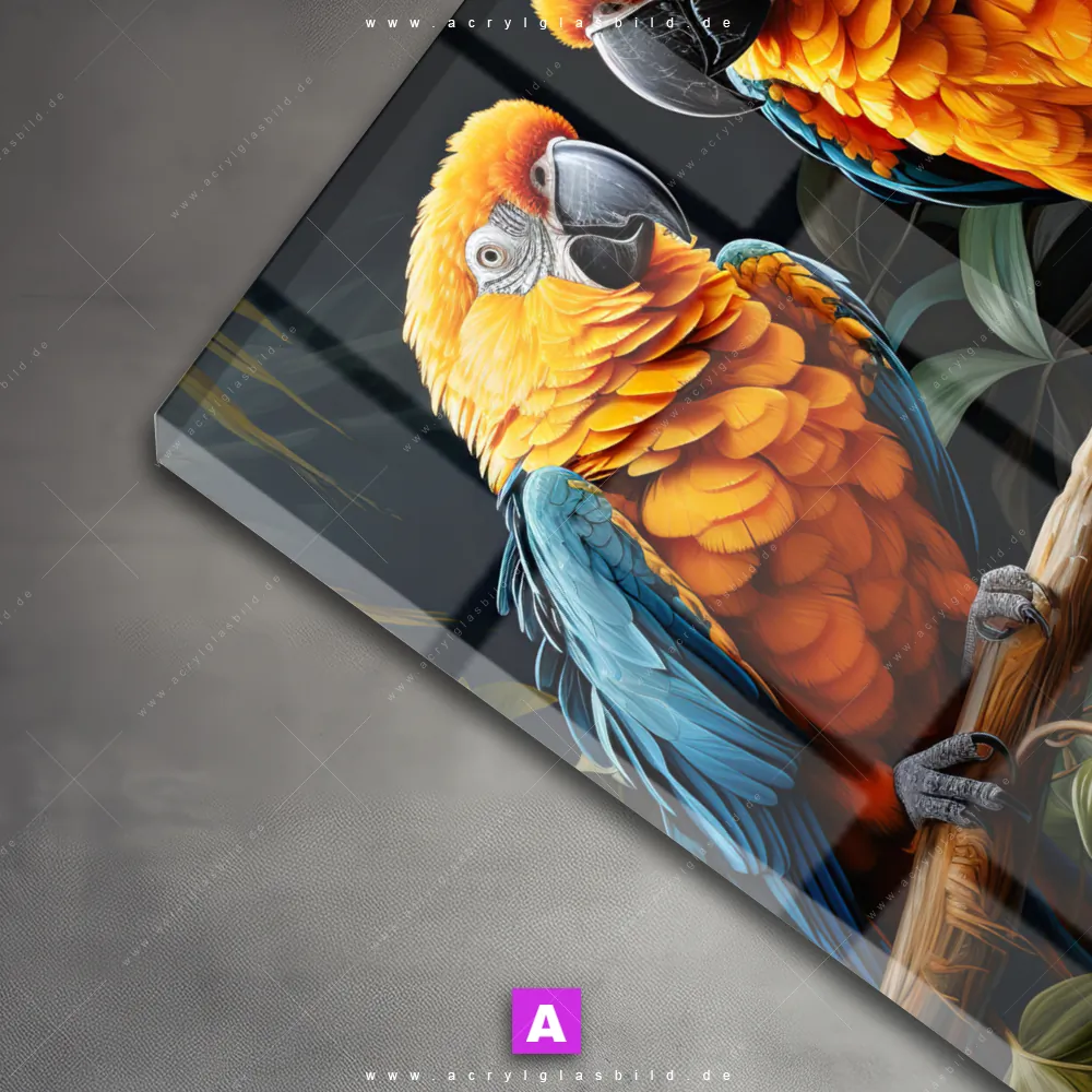 <b>Produktart:</b> Acrylglasbild | Glasbild | Wandbild aus Kunstglas | <b> Motiv:</b> Papageien auf einem Ast | <b> Bildausrichtung:</b> Quadrat | <b> Max. Motiv-Größe:</b> 405cm breit | 270cm hoch | <b> Verfügbare Formate: </b> Quadrat, Querformat, Hochformat, Panorama, Schmal, Rund | <b> Kategorie:</b> Tierwelt, Wald - Bäume | <b> Farben:</b> Braun, Grün, Orange, Blau | <b> Kunstformen:</b> KI-generiertes Bild, Digitale Kunst | <b> Kunststile:</b> Modern Art, Surreal - Fantasy