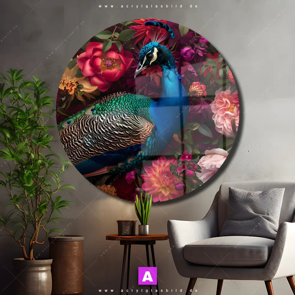 <b>Produktart:</b> Acrylglasbild | Glasbild | Wandbild aus Kunstglas | <b> Motiv:</b> Prachtvoller Pfau und Blüten | <b> Bildausrichtung:</b> Rund | <b> Max. Motiv-Größe:</b> 360cm breit | 240cm hoch | <b> Verfügbare Formate: </b> Quadrat, Querformat, Hochformat, Panorama, Schmal, Rund | <b> Kategorie:</b> Tierwelt, Blumen - Botanik | <b> Farben:</b> Rosa, Rot, Pink, Blau, Grün | <b> Kunstformen:</b> Digitale Kunst, Fotografie | <b> Kunststile:</b> Floral, Natürlich - Realistisch