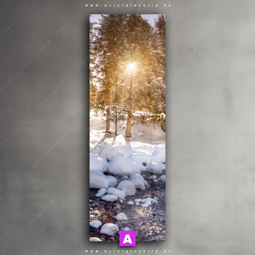 Acrylglasbild | Schneebedeckte Landschaft am Fluss | Schmal