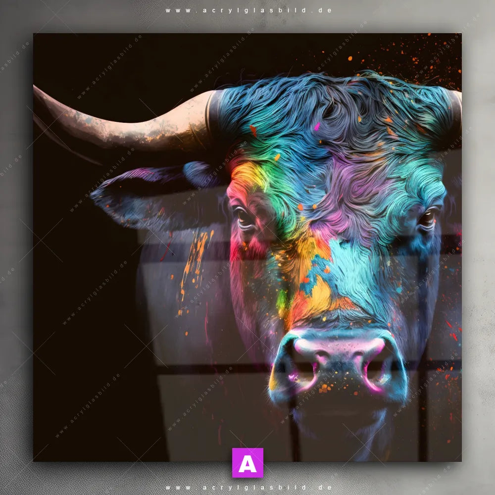 <b>Produktart:</b> Acrylglasbild | Glasbild | Wandbild aus Kunstglas | <b> Motiv:</b> Stier mit bunten Farben | <b> Bildausrichtung:</b> Quadrat | <b> Max. Motiv-Größe:</b> 315cm breit | 210cm hoch | <b> Verfügbare Formate: </b> Quadrat, Querformat, Hochformat, Panorama, Schmal, Rund | <b> Kategorie:</b> Tierwelt | <b> Farben:</b> Bunt, Schwarz | <b> Kunstformen:</b> Digitale Kunst | <b> Kunststile:</b> Modern Art, Pop Art
