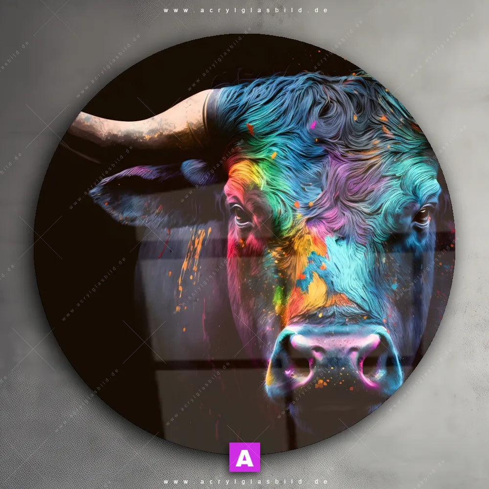 <b>Produktart:</b> Acrylglasbild | Glasbild | Wandbild aus Kunstglas | <b> Motiv:</b> Stier mit bunten Farben | <b> Bildausrichtung:</b> Rund | <b> Max. Motiv-Größe:</b> 315cm breit | 210cm hoch | <b> Verfügbare Formate: </b> Quadrat, Querformat, Hochformat, Panorama, Schmal, Rund | <b> Kategorie:</b> Tierwelt | <b> Farben:</b> Bunt, Schwarz | <b> Kunstformen:</b> Digitale Kunst | <b> Kunststile:</b> Modern Art, Pop Art