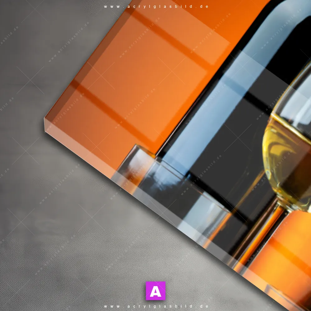 Das Motiv Stillleben Flaschen Gläser wird im UV-Direktdruck in den Farben Gold, Orange, Rot auf die Rückseite einer 5mm starken, transparenten Acrylglasplatte gedruckt. Das durchscheinende Motiv Genussvolle Abendstimmung im Natürlich - Realistisch Stil wird anschließend vollflächig mit einer weißen Schicht hinterlegt. Das Essen - Trinken Acrylglasbild | Panorama erhält so eine bemerkenswerte Farbbrillanz, hohe Schärfe und erstaunliche Tiefenwirkung.