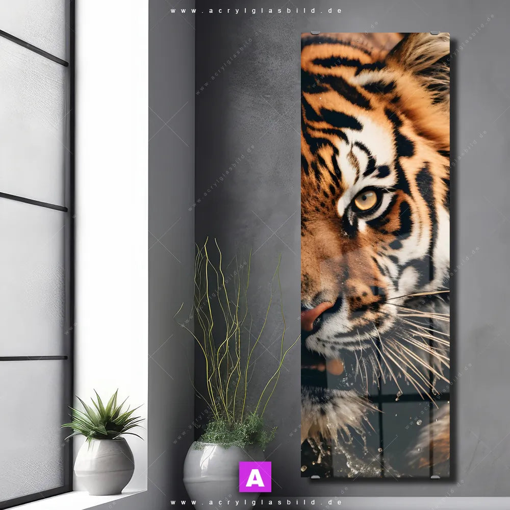 <b>Produktart:</b> Acrylglasbild | Glasbild | Wandbild aus Kunstglas | <b> Motiv:</b> Tiger im Wasser | <b> Bildausrichtung:</b> Schmal | <b> Max. Motiv-Größe:</b> 290cm breit | 180cm hoch | <b> Verfügbare Formate: </b> Quadrat, Querformat, Hochformat, Panorama, Schmal, Rund | <b> Kategorie:</b> Tierwelt | <b> Farben:</b> Braun, Beige, Schwarz | <b> Kunstformen:</b> Digitale Kunst, KI-generiertes Bild | <b> Kunststile:</b> Modern Art