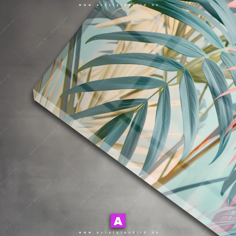Also, worauf wartest du noch? Verwandle deine schlichten Wände in inspirierende Kunstwerke und bestelle jetzt das Acrylglasbild Palmenblätter in Mint & Rosa!