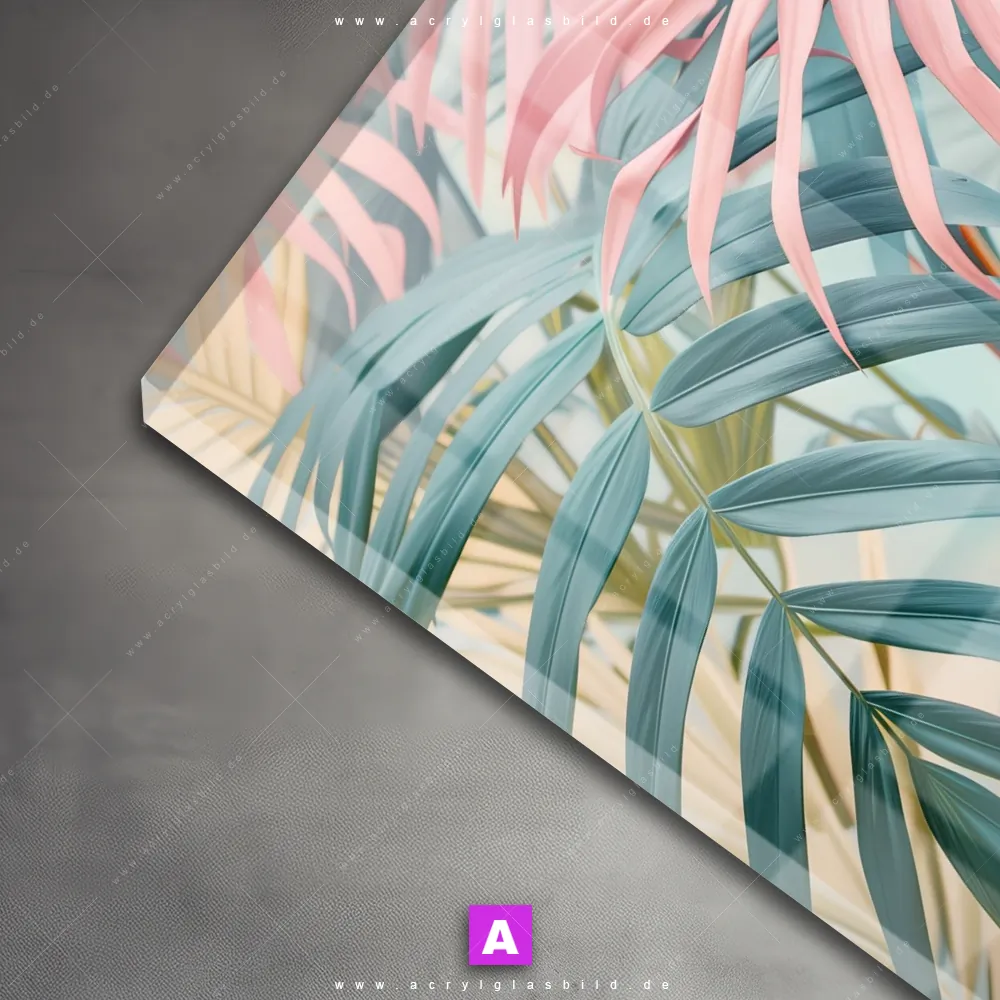 Also, worauf wartest du noch? Verleihe deinen Wänden das gewisse Etwas und bestelle jetzt das Acrylglasbild Palmenblätter in Mint & Rosa!