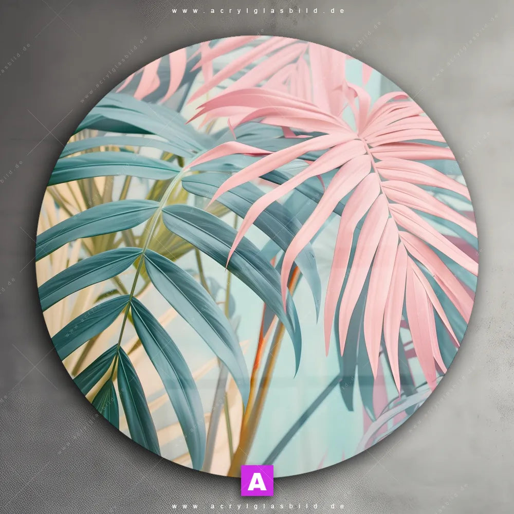 Hey du! Bist du es auch leid, auf langweilige, weiße Wände in deinem Raum zu starren und dich zu fragen, ob das der Sinn des Lebens ist? Unser Acrylglasbild mit dem Titel Tropische Blätter in Pastellfarben im Format Rund verwandelt deine Wand in ein Kunstwerk und macht deinen Raum zum absoluten Hingucker.