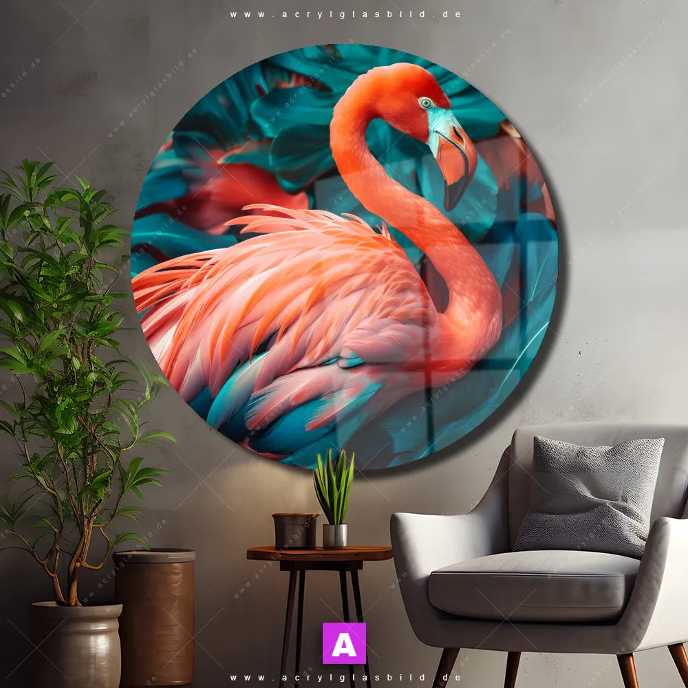 <b>Produktart:</b> Acrylglasbild | Glasbild | Wandbild aus Kunstglas | <b> Motiv:</b> Tropischer Flamingo Traum | <b> Bildausrichtung:</b> Rund | <b> Max. Motiv-Größe:</b> 450cm breit | 300cm hoch | <b> Verfügbare Formate: </b> Quadrat, Querformat, Hochformat, Panorama, Schmal, Rund | <b> Kategorie:</b> Tierwelt, Blumen - Botanik | <b> Farben:</b> Orange, Rot, Weiss, Schwarz | <b> Kunstformen:</b> Digitale Kunst, KI-generiertes Bild | <b> Kunststile:</b> Floral, Modern Art, Natürlich - Realistisch
