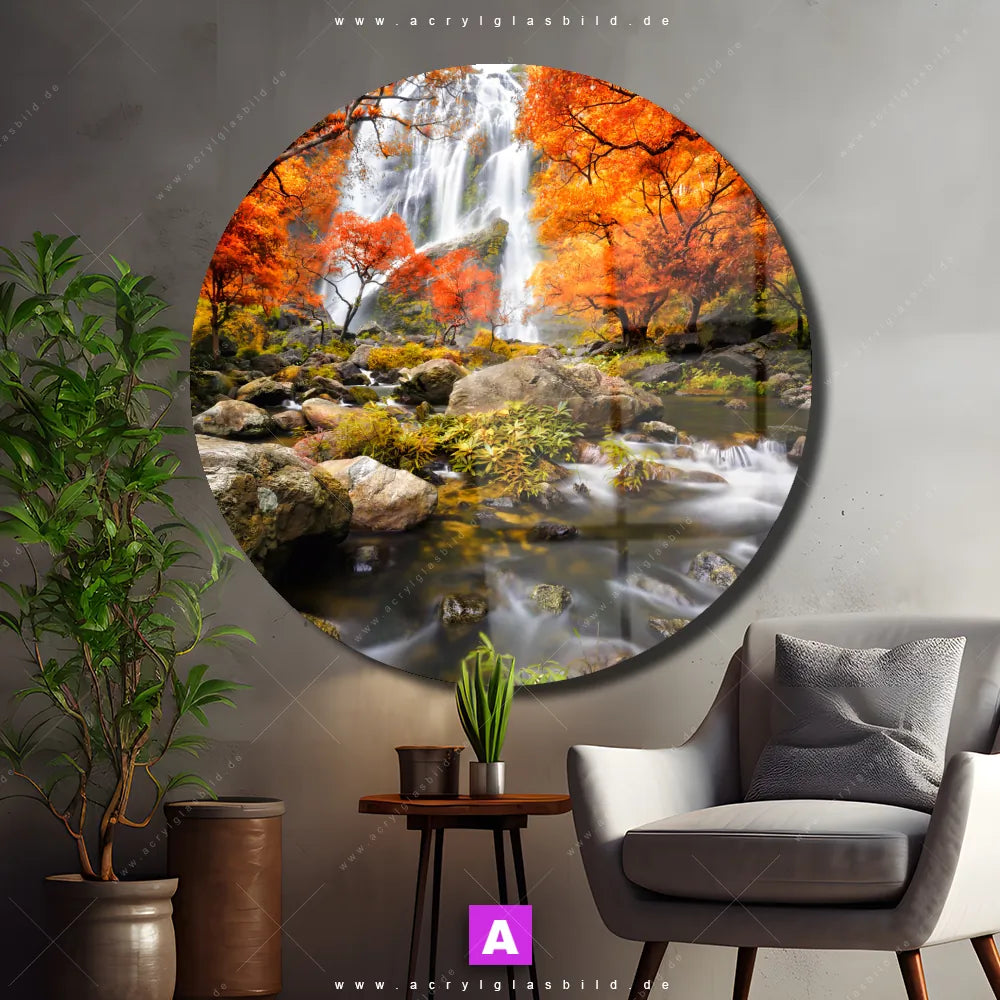 <b>Produktart:</b> Acrylglasbild | Glasbild | Wandbild aus Kunstglas | <b> Motiv:</b> Wasserfall in Herbstlandschaft | <b> Bildausrichtung:</b> Rund | <b> Max. Motiv-Größe:</b> 450cm breit | 300cm hoch | <b> Verfügbare Formate: </b> Quadrat, Querformat, Hochformat, Panorama, Schmal, Rund | <b> Kategorie:</b> Landschaften | <b> Farben:</b> Rot, Orange | <b> Kunstformen:</b> Fotografie | <b> Kunststile:</b> Natürlich - Realistisch