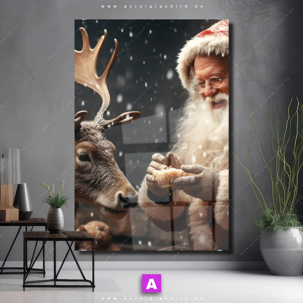 Hallo, auf Wiedersehen langweilige Wände! Gib deinem Raum ein stilvolles Upgrade mit unserem Acrylglasbild Weihnachtsmann füttert Rentier im Hochformat, das nicht nur Flur - Eingangsbereich, Wohnzimmer - Schlafzimmer, sondern auch jeden anderen Raum im Handumdrehen auf ein neues Niveau hebt!