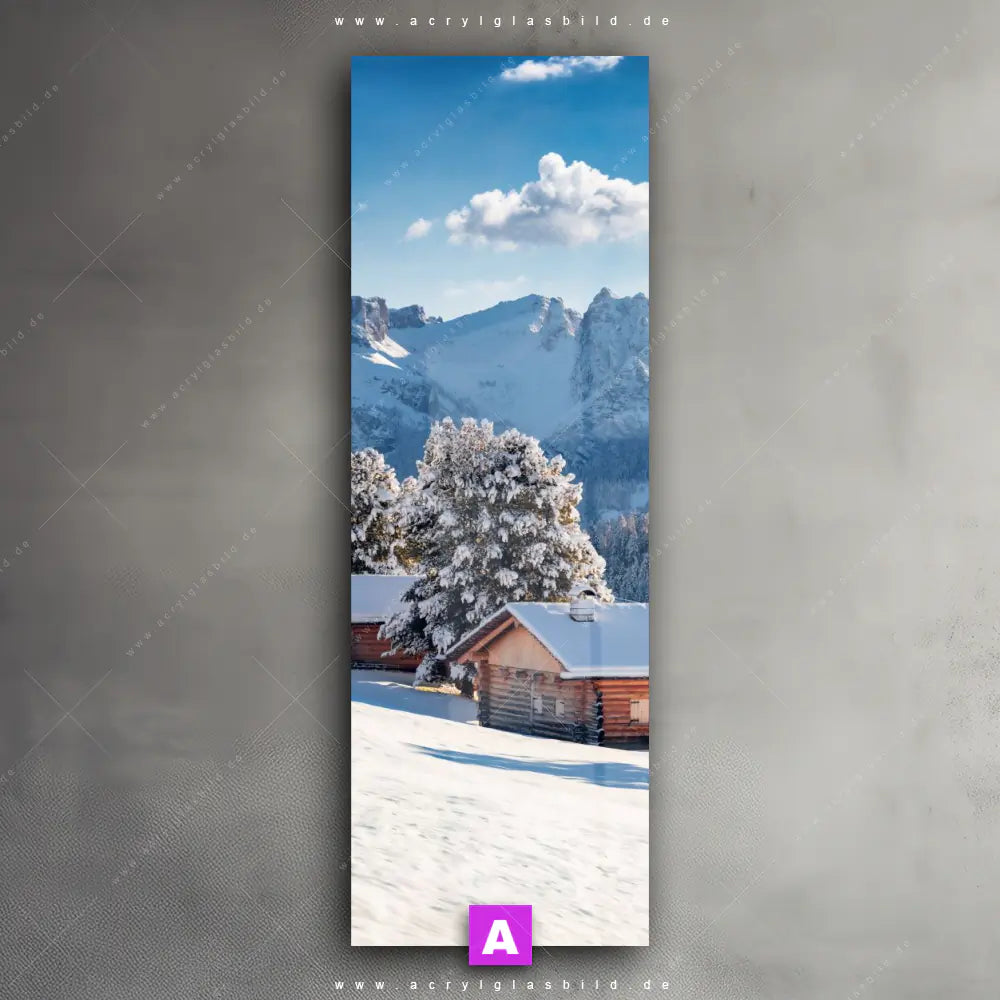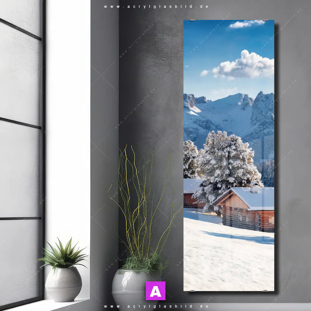 <b>Produktart:</b> Acrylglasbild | Glasbild | Wandbild aus Kunstglas | <b> Motiv:</b> Winteridylle in den Bergen | <b> Bildausrichtung:</b> Schmal | <b> Max. Motiv-Größe:</b> 520cm breit | 300cm hoch | <b> Verfügbare Formate: </b> Quadrat, Querformat, Hochformat, Panorama, Schmal, Rund | <b> Kategorie:</b> Landschaften, Winter | <b> Farben:</b> Blau, Weiss, Braun | <b> Kunstformen:</b> Fotografie | <b> Kunststile:</b> Natürlich - Realistisch