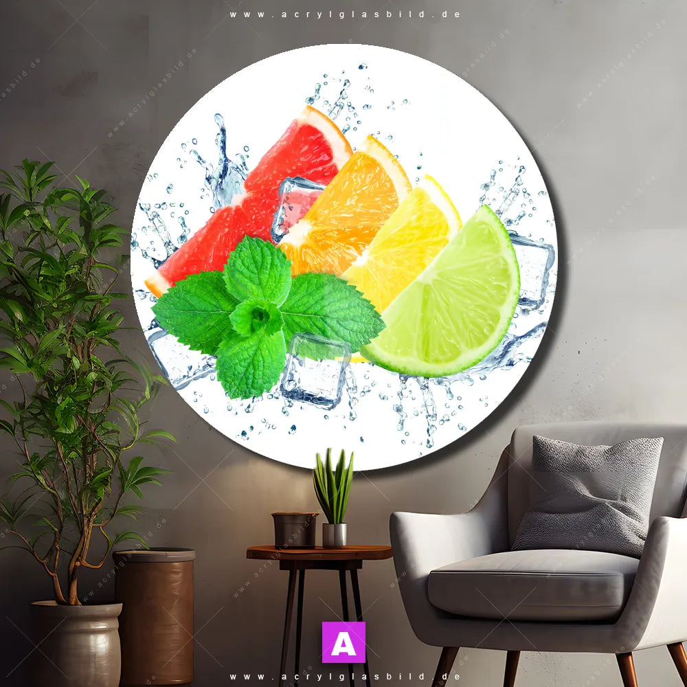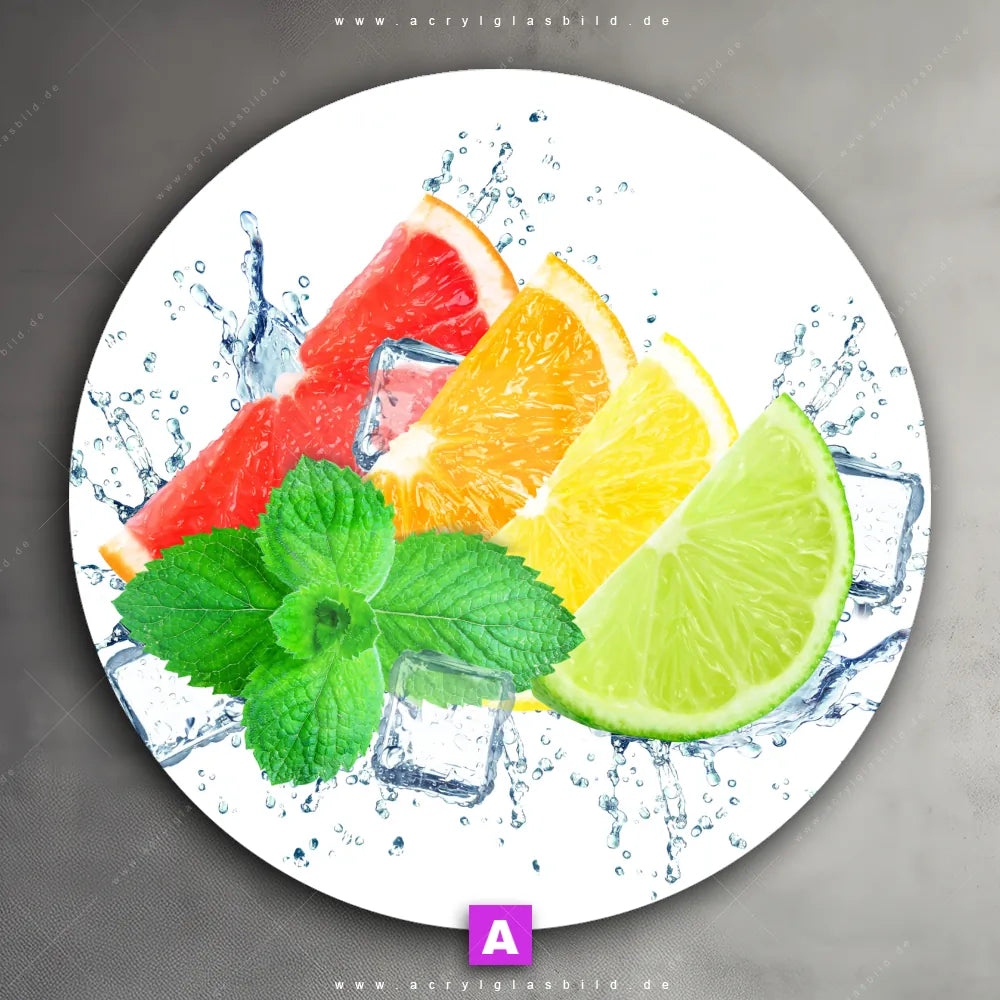Hey du! Bist du es auch leid, auf langweilige, weiße Wände in deinem Raum zu starren und dich zu fragen, ob das der Sinn des Lebens ist? Unser Acrylglasbild mit dem Titel Zitrusfrüchte auf Eis im Format Rund verwandelt deine Wand in ein Kunstwerk und macht deinen Raum zum absoluten Hingucker.