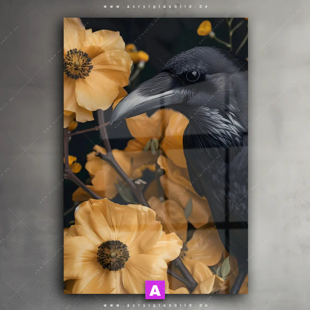 <b>Produktart:</b> Acrylglasbild | Glasbild | Wandbild aus Kunstglas | <b> Motiv:</b> Naturbild - Rabe & Blüten | <b> Bildausrichtung:</b> Hochformat | <b> Max. Motiv-Größe:</b> 270cm breit | 180cm hoch | <b> Verfügbare Formate: </b> Quadrat, Querformat, Hochformat, Panorama, Schmal, Rund | <b> Kategorie:</b> Tierwelt, Blumen - Botanik | <b> Farben:</b> Schwarz, Beige, Ocker, Gelb | <b> Kunstformen:</b> Digitale Kunst, Fotografie | <b> Kunststile:</b> Floral, Natürlich - Realistisch
