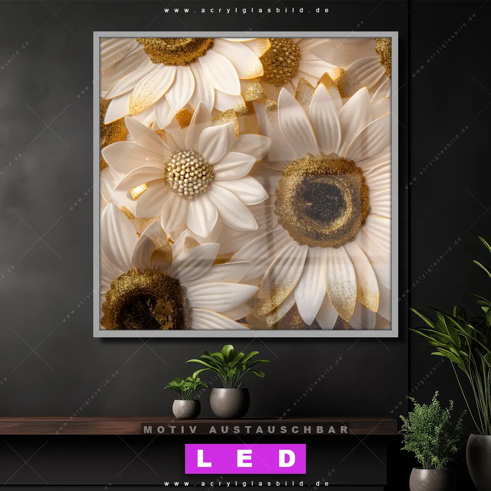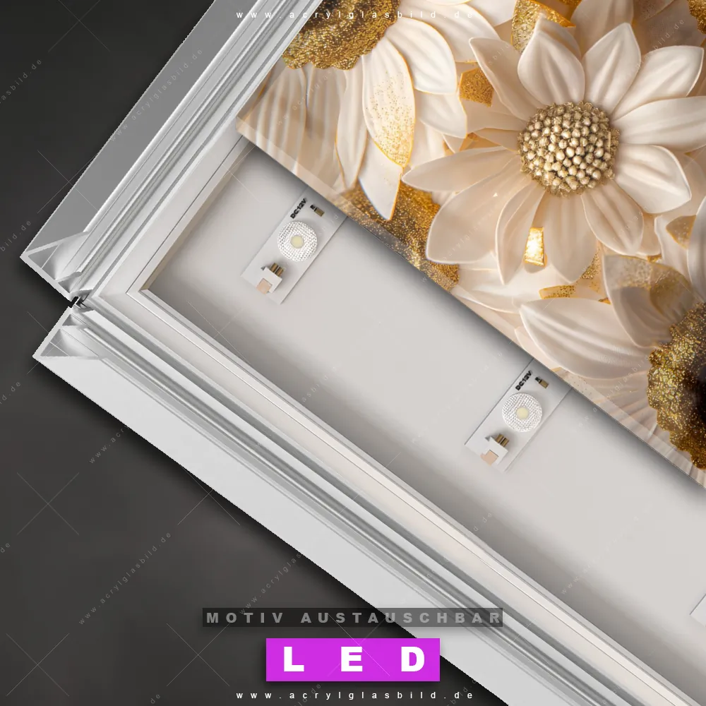 Bist du bereit, deine Wände mit einem dimmbaren LED Bild mit Fernbedienung und optionaler Farbtemperatursteuerung zum Leuchten zu bringen? Wir haben das ultimative Blumen - Botanik LED Acrylglasbild Canvalight® DIA für dich! Unser LED Wandbild aus Acrylglas Goldene Blütenpracht im Quadratischen Format mit austauschbarer bedruckter Acrylglas-Scheibe im DIA-Klapprahmen bringt sofort jede Menge Glanz in deine vier Wände.