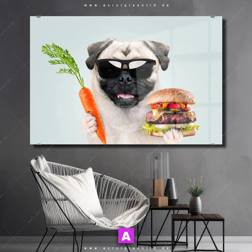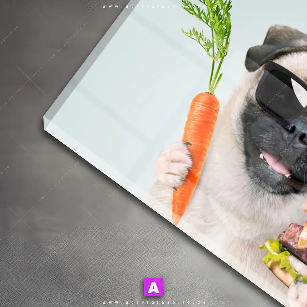 Unser Acrylglasbild Hund und Food Humor aus der Kategorie Tierwelt, Essen - Trinken wird deinem Raum einen Hauch von Luxus verleihen, und du wirst nie wieder von Langeweile geplagt sein. Und wenn du nach einem Bild mit Tier, Hund, Welpe, Mops, Fast Food, Gemüse, Lebensmittel, Sonnenbrille, lustig, Karotte, Burger suchst, empfehlen wir dir unser Acrylglasbild Veggie oder Burger in den aufregenden Farben Beige, Schwarz, Orange, Grün. Mit seiner Gestaltung als Digitale Kunst, Fotografie passt es hervorragend zum Modern Art-Stil.