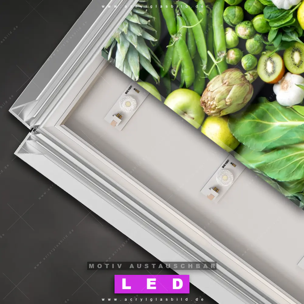 Also, worauf wartest du noch? Gib mit einem beleuchteten Wandbild mit wechselbarer Acrylglas-Scheibe deinen Wänden das gewisse Etwas und bestelle jetzt das LED Acrylglasbild Canvalight® DIA Gesunde Ernährung – dein Zuhause wird es dir danken und deine Freunde werden dank der wechselbaren Motive erblassen!