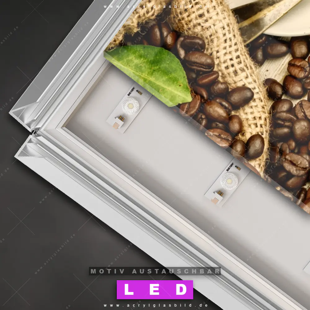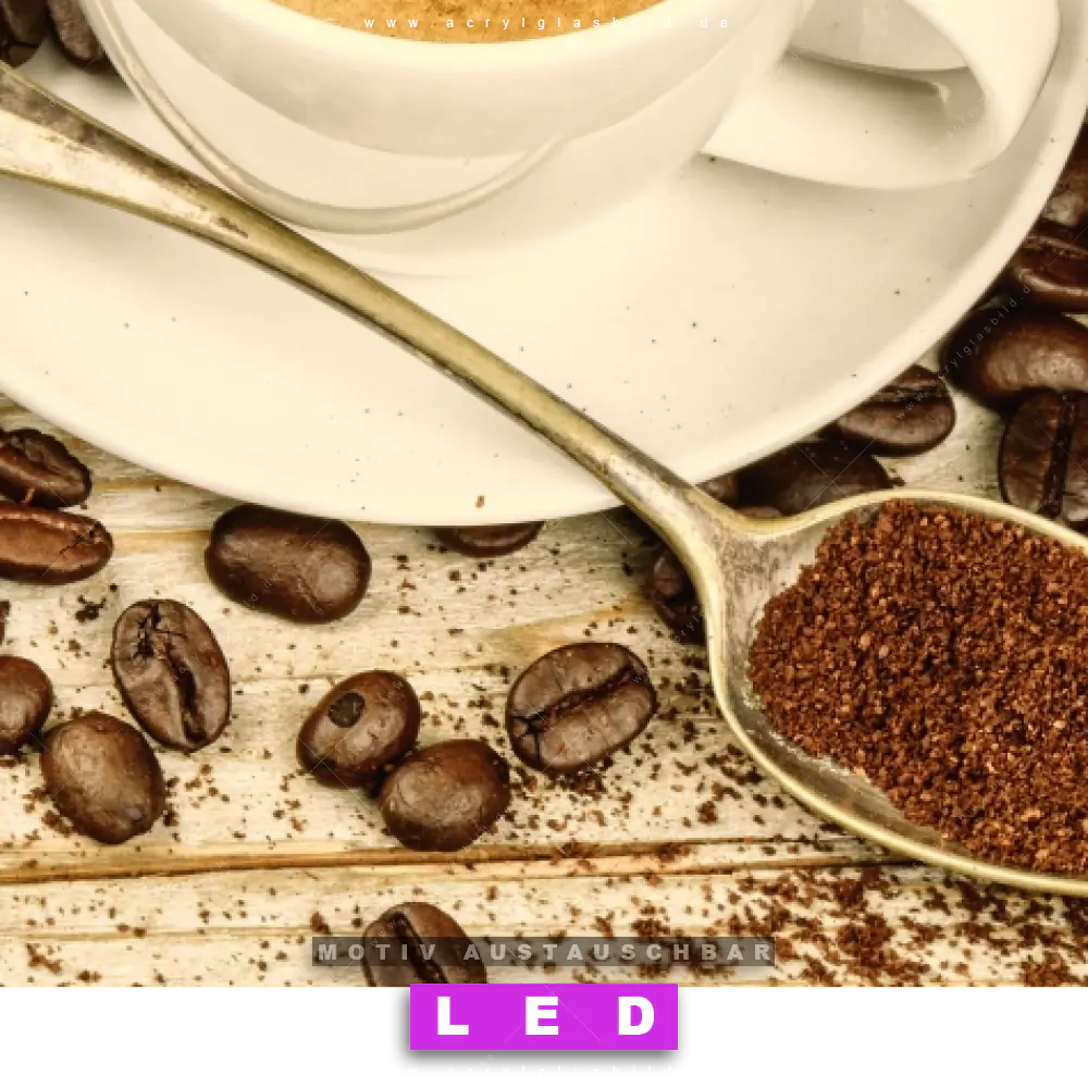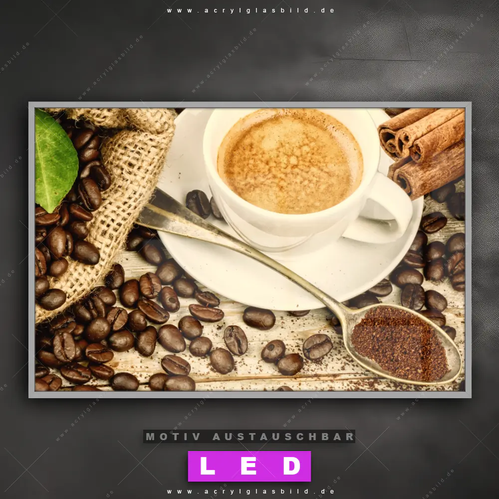 Du bist auf der Suche nach einem dimmbaren Essen - Trinken LED Bild mit Fernbedienung und optionaler Farbtemperatursteuerung? Dann haben wir hier genau das richtige Wandbild mit LED Beleuchtung für dich: Unser Canvalight® DIA LED Acrylglasbild Kaffeeliebe pur im Querformat mit austauschbarer bedruckter Acrylglas-Scheibe. Dieses Leuchtbild bringt sofort Partybeleuchtung in deine Räume!