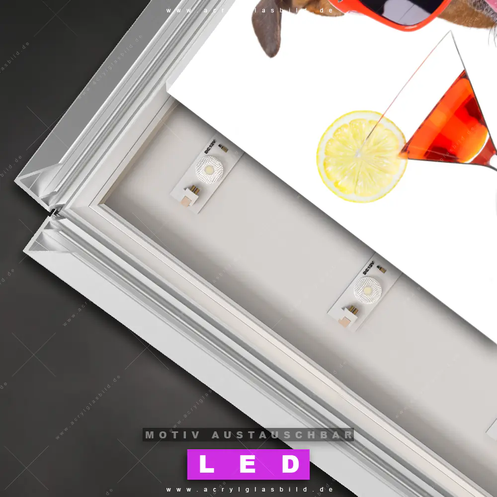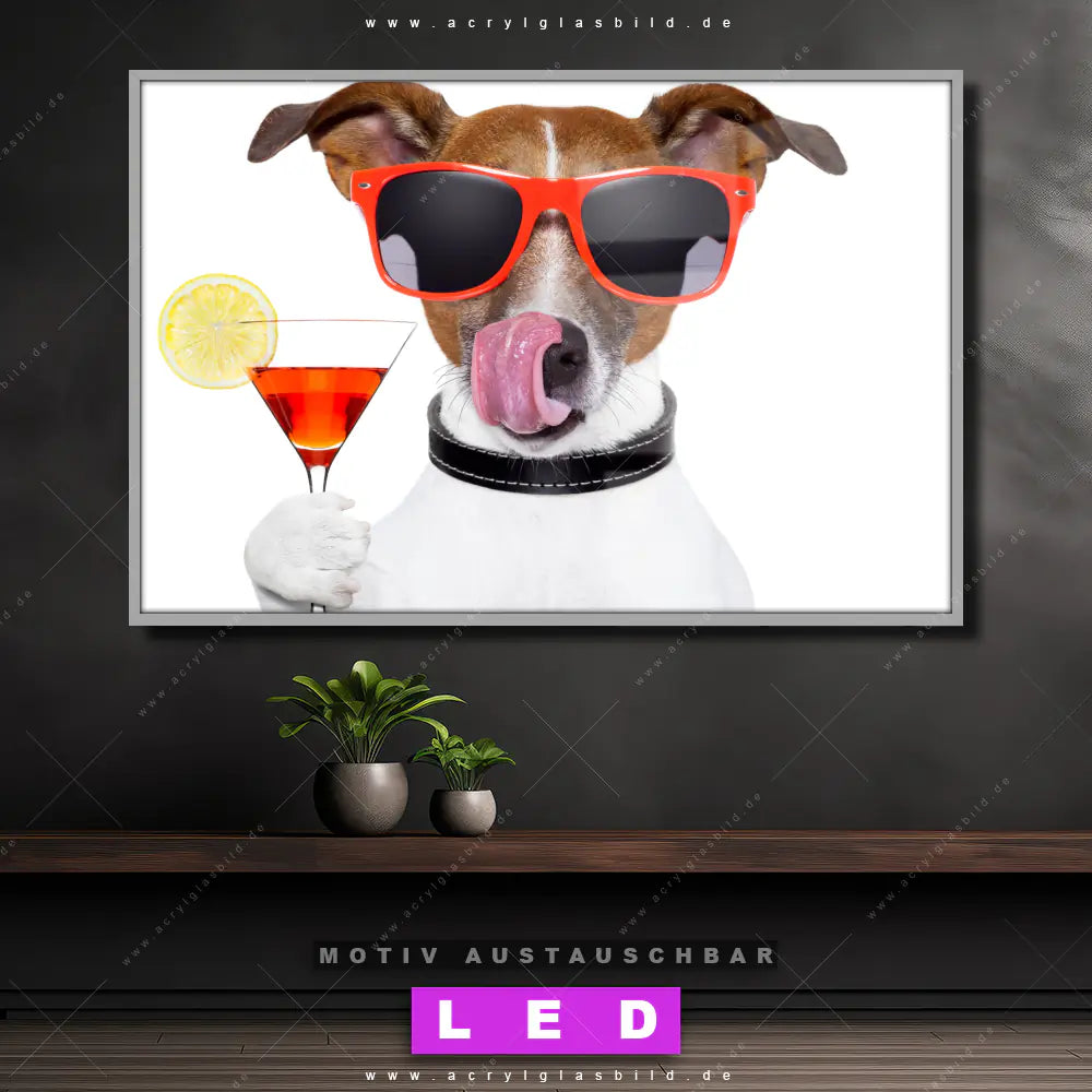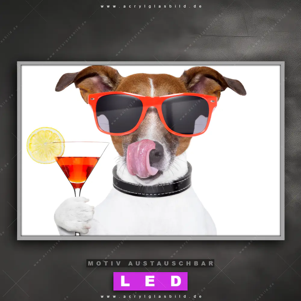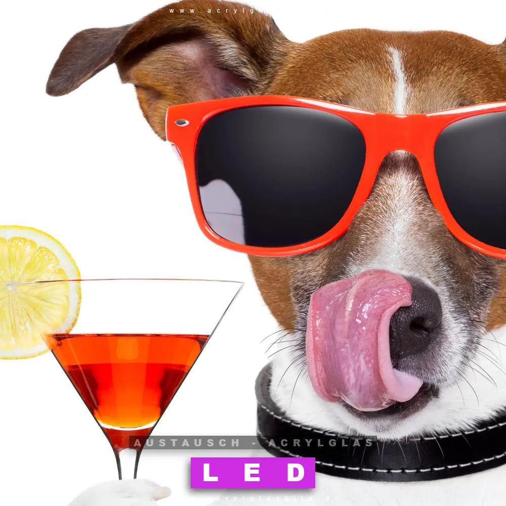Du bist auf der Suche nach einem dimmbaren Tierwelt, Essen - Trinken LED Bild mit Fernbedienung und optionaler Farbtemperatursteuerung? Dann haben wir hier genau das richtige Wandbild mit LED Beleuchtung für dich: Unser Canvalight® DIA LED Acrylglasbild Lustiger Hund mit Drink im Querformat mit austauschbarer bedruckter Acrylglas-Scheibe. Dieses Leuchtbild bringt sofort Partybeleuchtung in deine Räume!