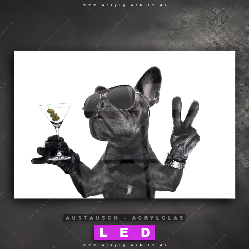 Begriffe wie Bulldogge, Tier, Hund, Französiche Bulldogge, Cocktail, Martini, Sonnenbrille haben dich auf der Suche nach deinem neuen Austausch-Acrylglasbild inspiriert? Dann sollte das Wechsel-Acrylglasbild Lustige Bulldogge mit Drink für dein bereits vorhandenes LED Acrylglasbild Canvalight® DIA den Weg zu dir finden.