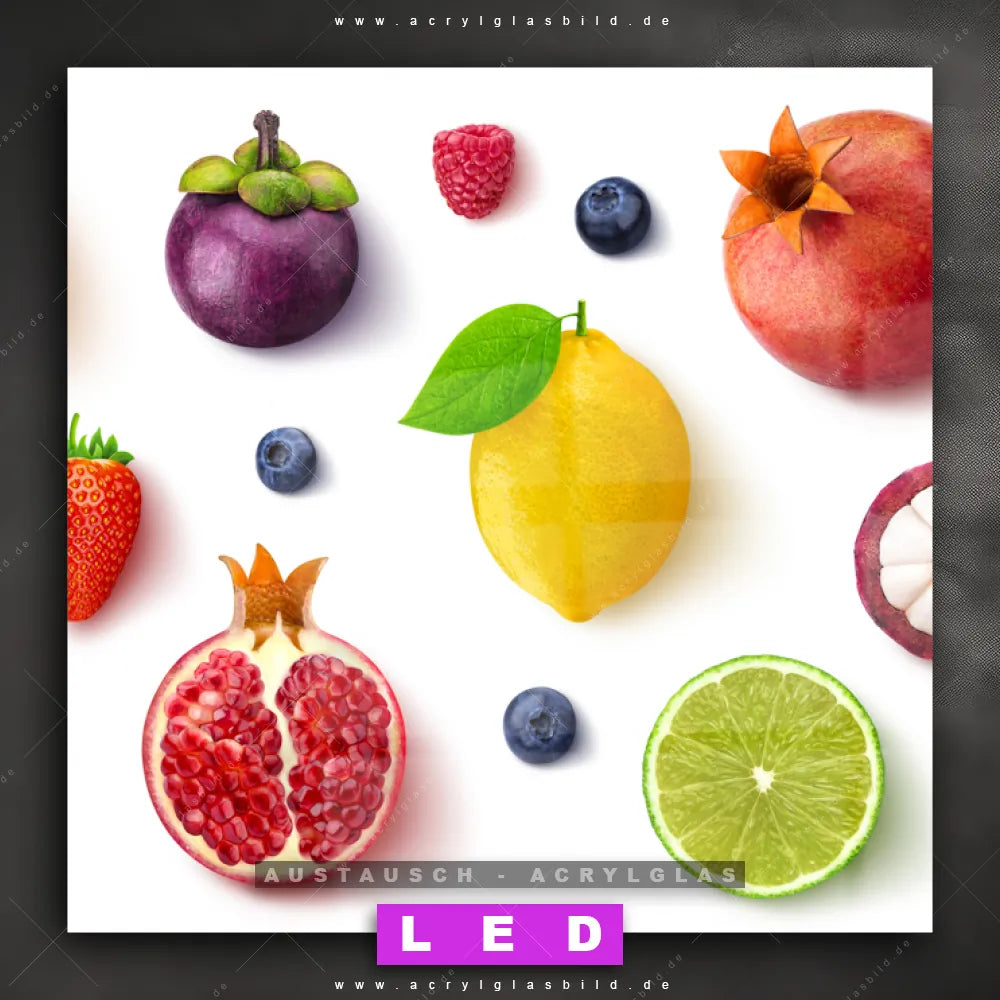 Begriffe wie Obst, Zitrusfrüchte, Früchte, Kiwi, frisch, spritzig, Ananas, Spritzer, Tropfen, Orange, Apfel, Zitrone, Granadapfel, Blaubeere haben dich auf der Suche nach deinem neuen Austausch-Acrylglasbild inspiriert? Dann sollte das Wechsel-Acrylglasbild Buntes Obst für dein bereits vorhandenes LED Acrylglasbild Canvalight® DIA den Weg zu dir finden.