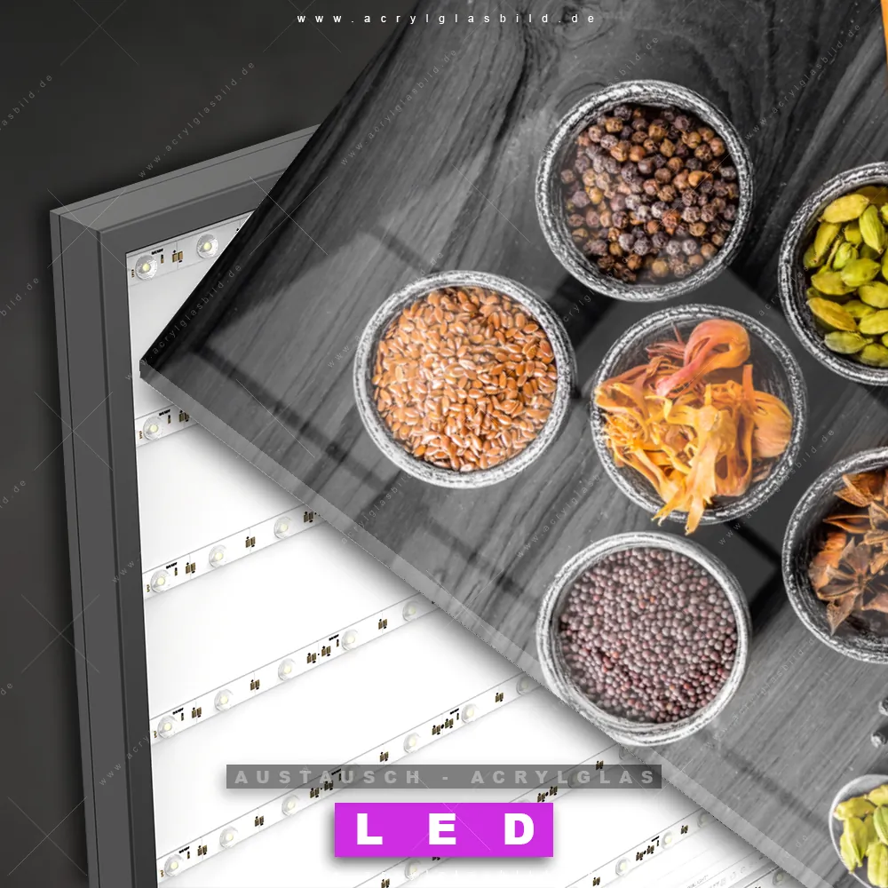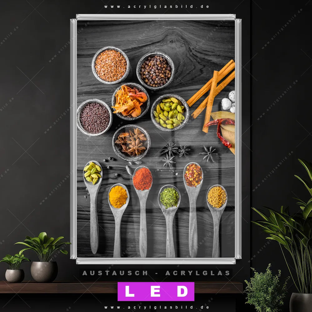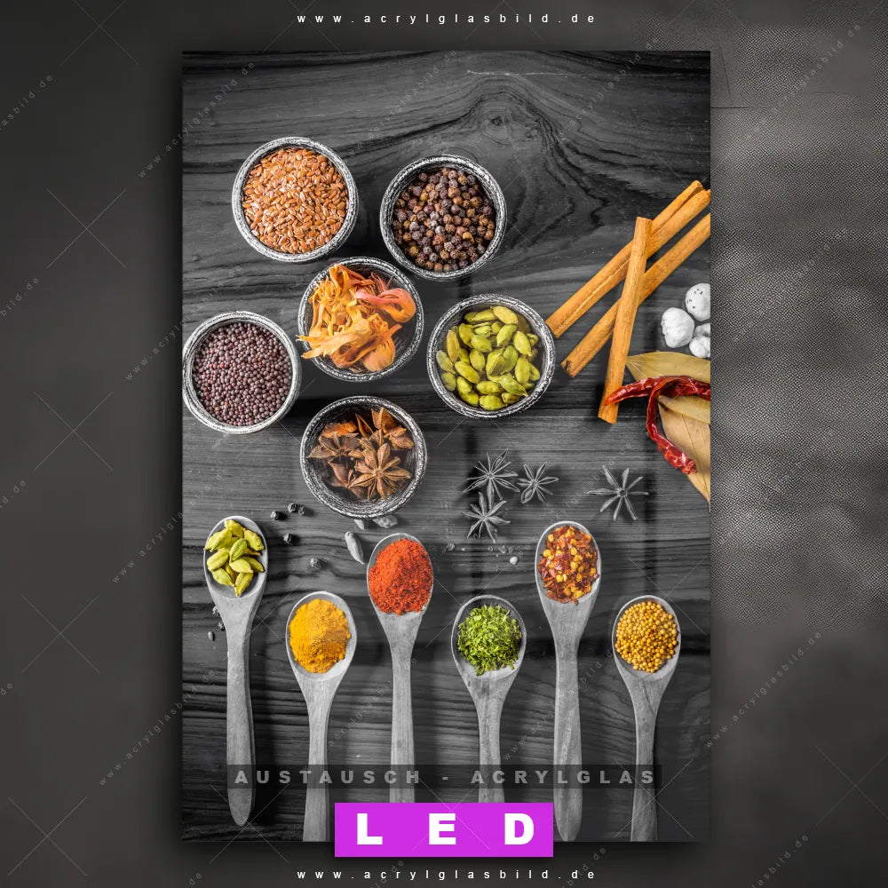 Begriffe wie Kräuter, Gewürze, Löffel, Besteck, kochen, Lebensmittel, Pulver, Körner haben dich auf der Suche nach deinem neuen Austausch-Acrylglasbild inspiriert? Dann sollte das Wechsel-Acrylglasbild graue Holzlöffel und Schalen mit Gewürzen für dein bereits vorhandenes LED Acrylglasbild Canvalight® DIA den Weg zu dir finden.