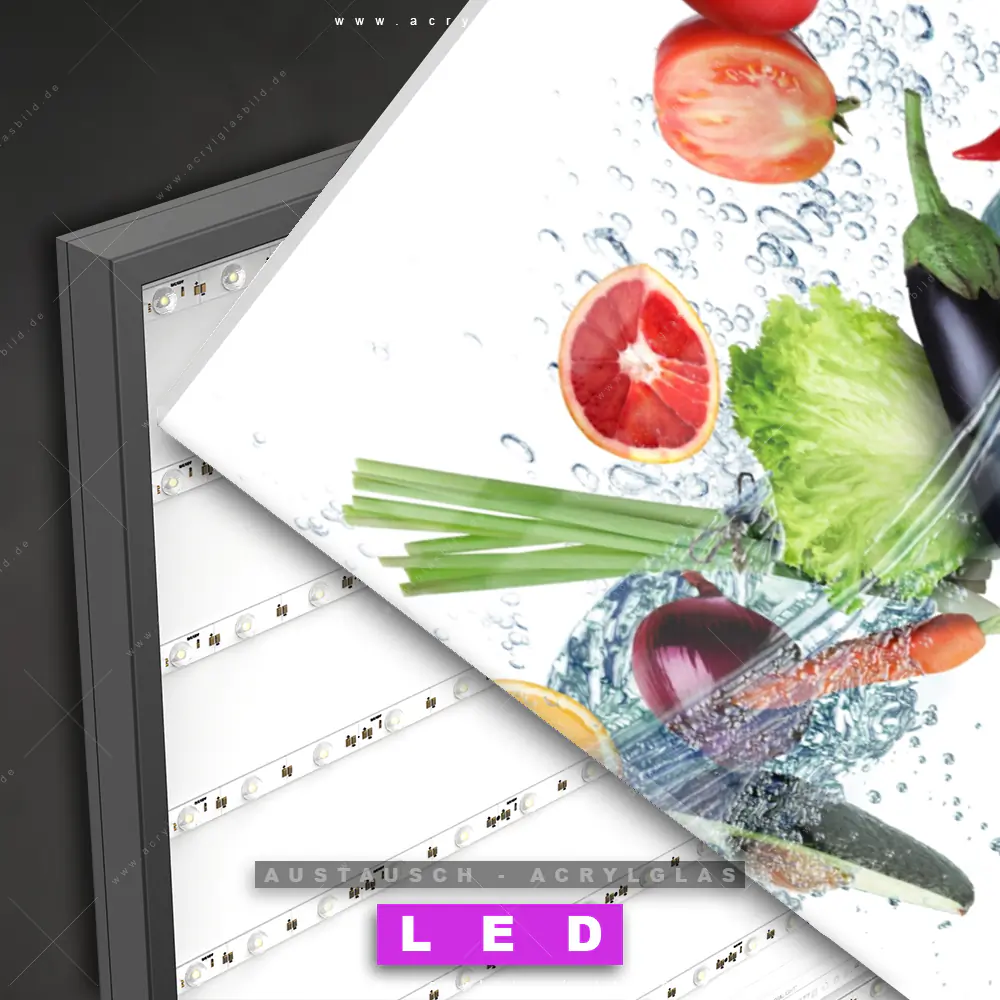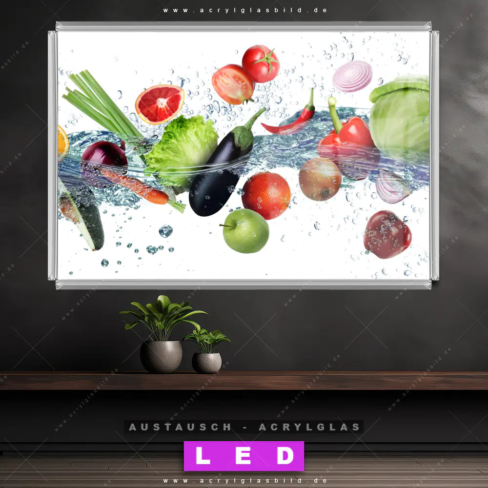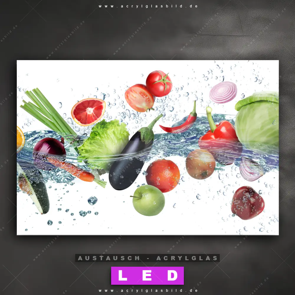 Begriffe wie Obst, Zitrusfrüchte, Früchte, Kiwi, frisch, spritzig, Ananas, Spritzwasser, Wasser, Spritzer, Tropfen, Wassertropfen, Orange, Apfel, Zitrone, Gemüse haben dich auf der Suche nach deinem neuen Austausch-Acrylglasbild inspiriert? Dann sollte das Wechsel-Acrylglasbild Gemüse - Splash der Frische für dein bereits vorhandenes LED Acrylglasbild Canvalight® DIA den Weg zu dir finden.