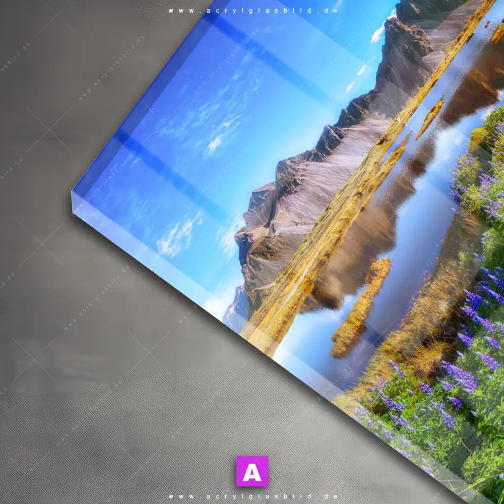 Das Motiv Schöner Tag in Island wird im UV-Direktdruck in den Farben Grün, Braun, Blau, Beige auf die Rückseite einer 5mm starken, transparenten Acrylglasplatte gedruckt. Das durchscheinende Motiv Berge und Lupinenblüten im Natürlich - Realistisch Stil wird anschließend vollflächig mit einer weißen Schicht hinterlegt. Das Landschaften Acrylglasbild | Rund erhält so eine bemerkenswerte Farbbrillanz, hohe Schärfe und erstaunliche Tiefenwirkung.