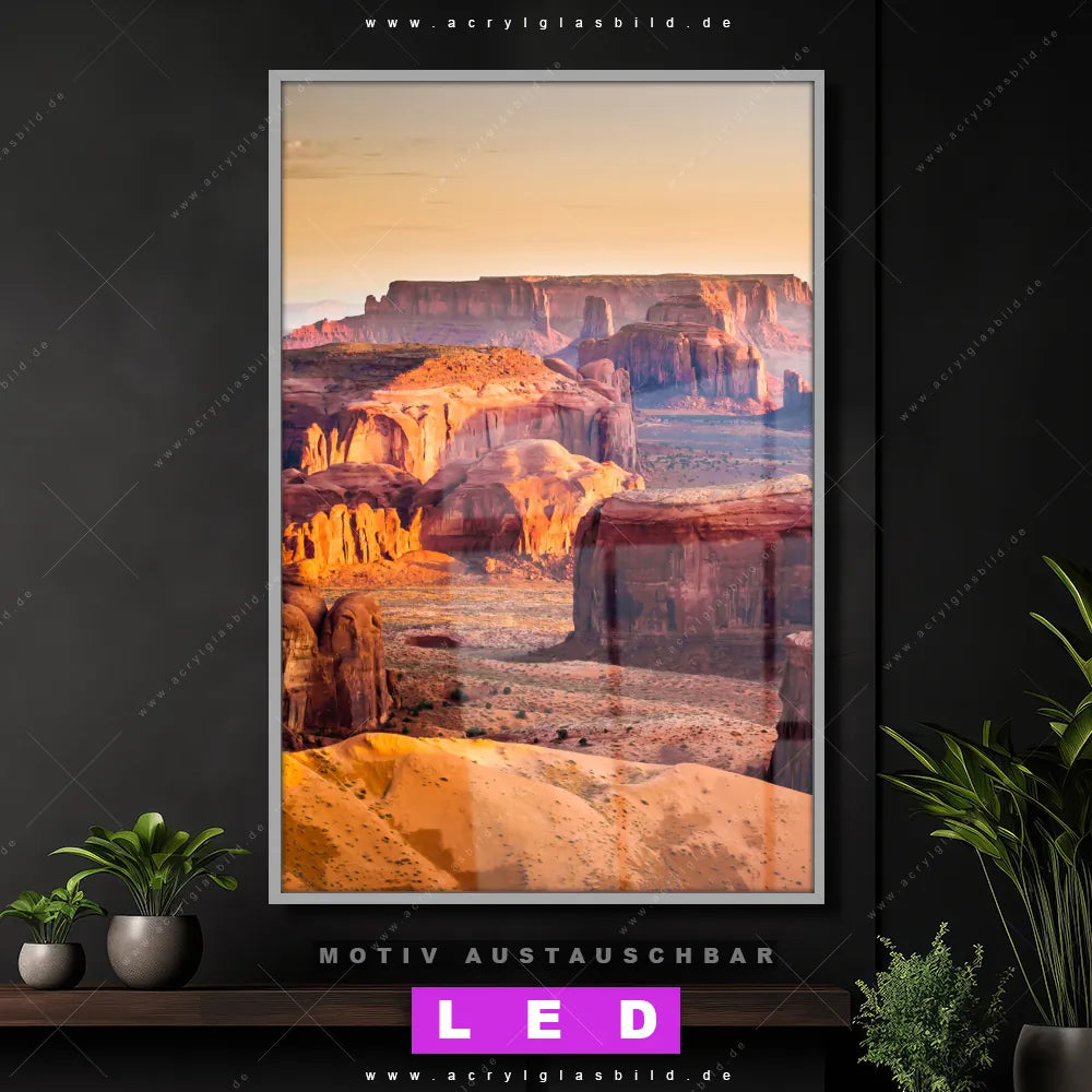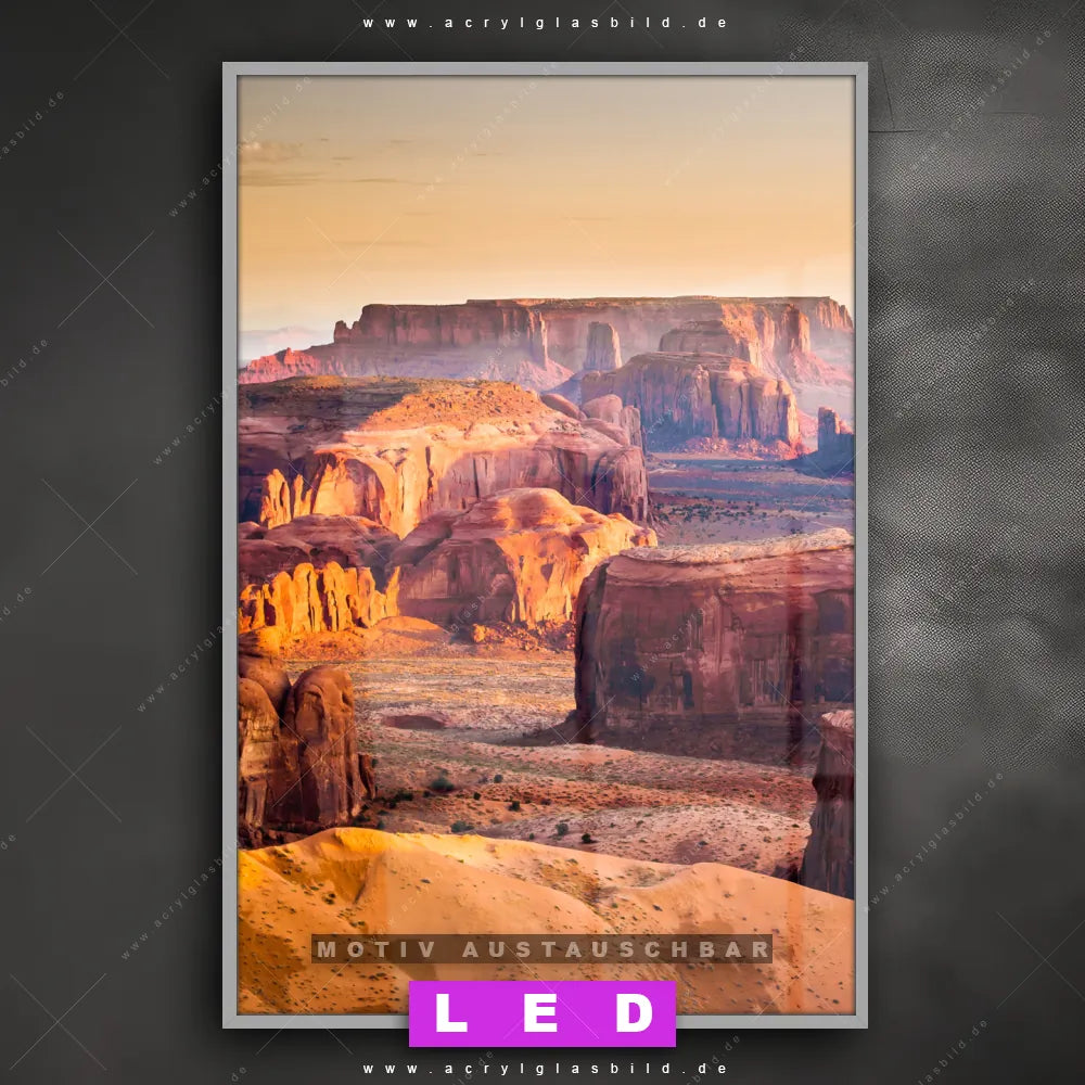 Wer braucht schon langweilige Wände, wenn man sie mit unserem LED Acrylglasbild Canvalight® DIA Monument Valley Felsen in der Abendröte aufpeppen kann? Dank der genialen LED-Ausleuchtung wirst du in Arzt - Praxis, Bar - Gastronomie, Büro - Kanzlei, Flur - Eingangsbereich, Wohnzimmer - Schlafzimmer nie wieder über deine eigenen Füße stolpern. Wenn du nach einem beleuchteten Wandbild aus Acrylglas mit Sehenswürdigkeit, USA, Landschaft, Sonnenuntergang, Steine suchst, dann ist unser LED Acrylglasbild Felsen in Wüstenlandschaft in den hammermäßigen Motiv-Farben Orange, Lila, Rot, Rosa, Blau, Grün genau das richtige LED Bild für dich. Im coolen Natürlich - Realistisch Stil gestaltet, passt das LED Leuchtbild mit DIA-Klapprahmen und glänzender Front aus Acrylglas perfekt zu jedem Einrichtungsstil – sogar zu deinem chaotischen Kreativlabor!