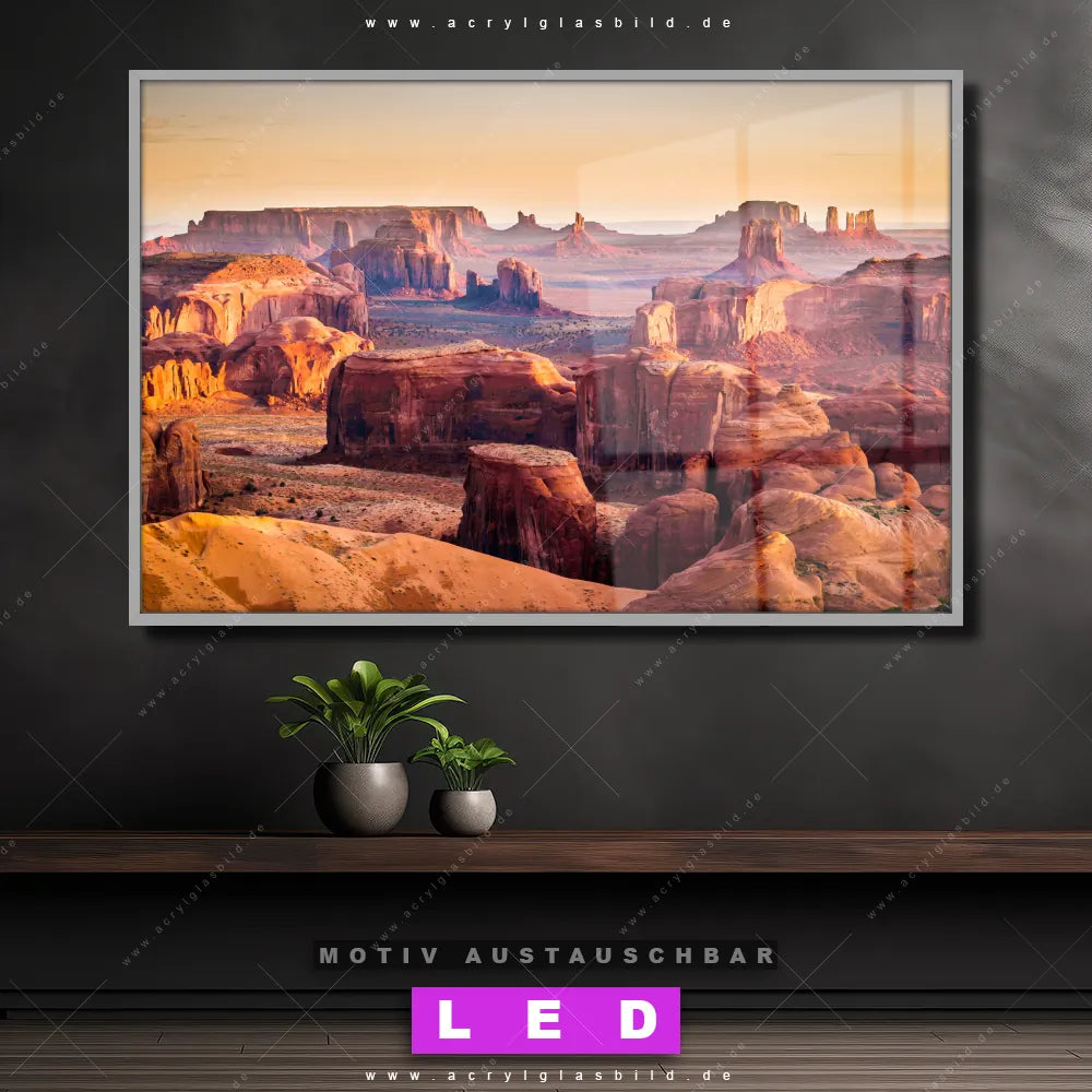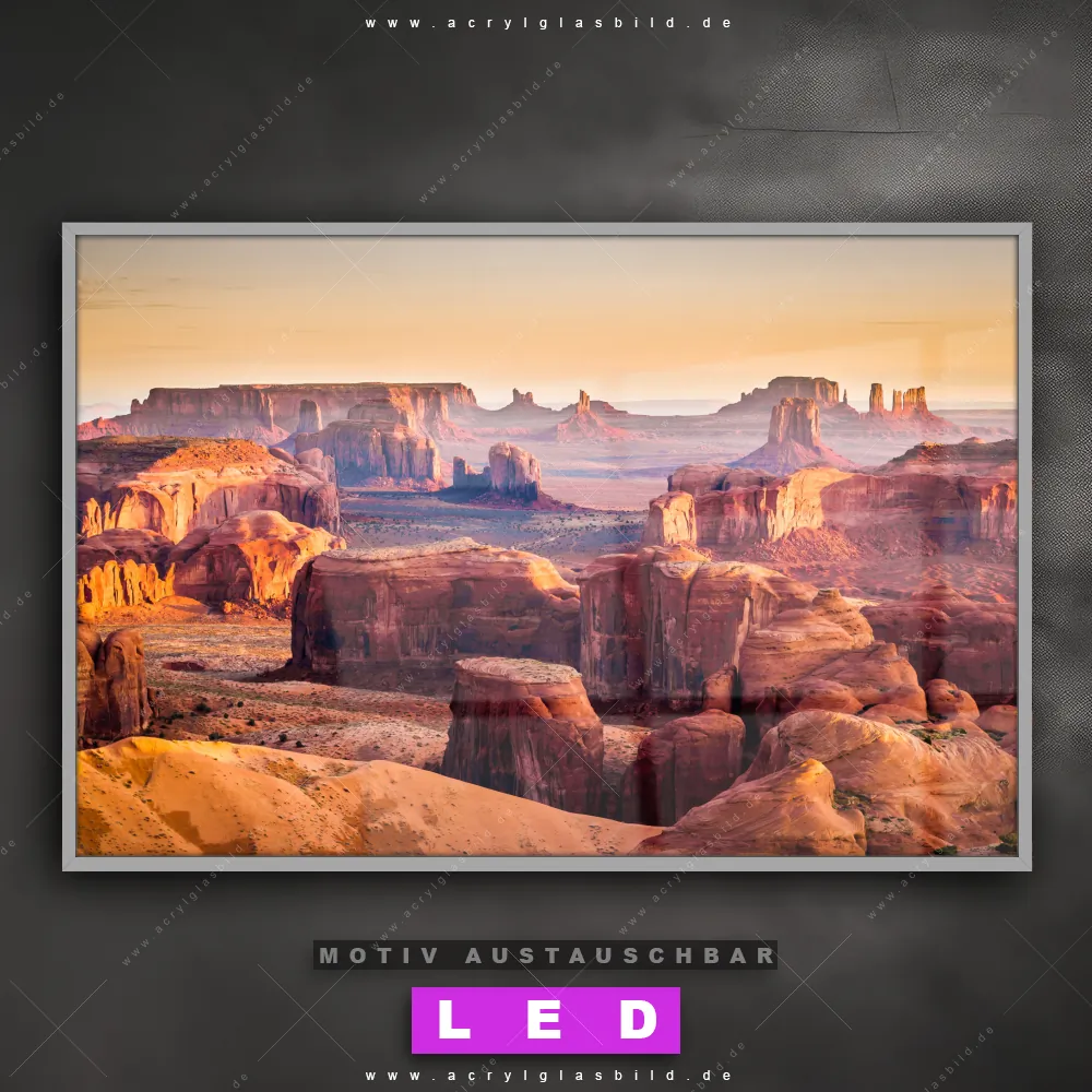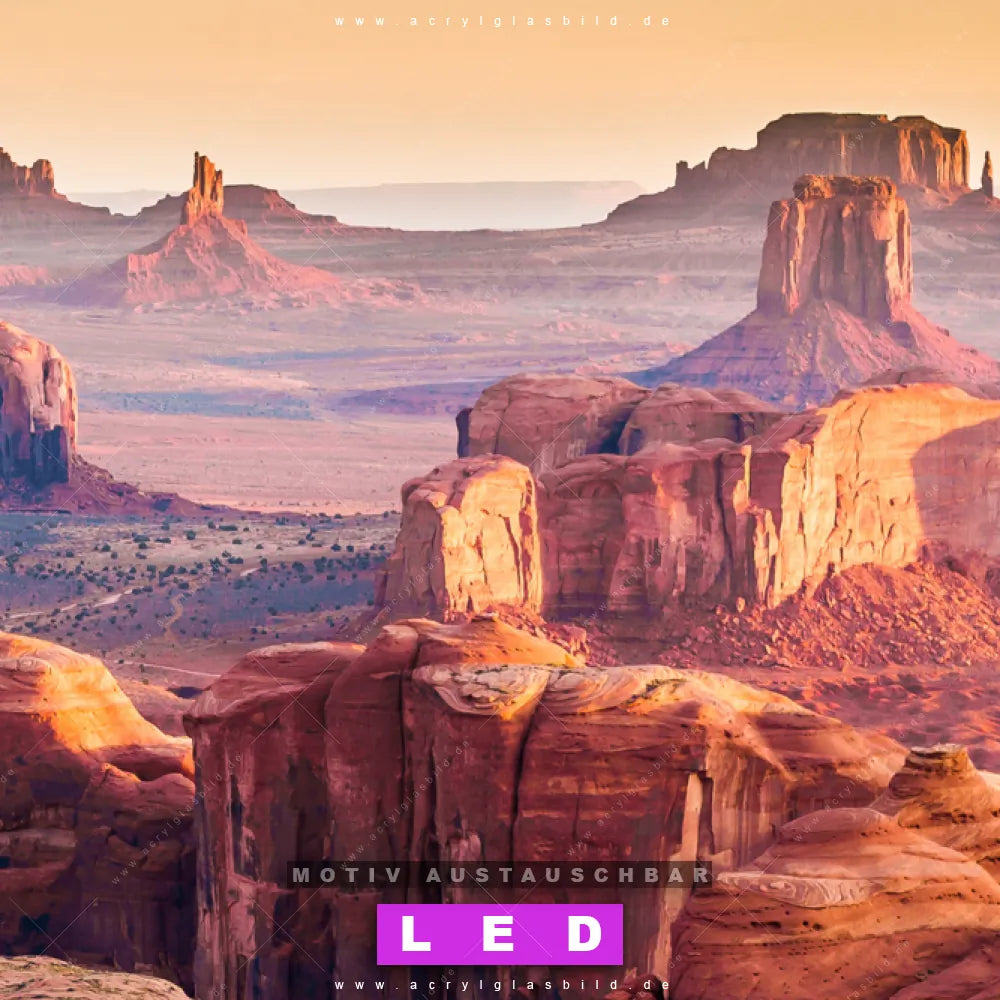 Mit unserem LED Acrylglasbild Canvalight® DIA Monument Valley Felsen in der Abendröte und seiner genialen LED-Ausleuchtung wirst du nie wieder im Dunkeln auf deinem Sofa herumtappen. Wenn du nach einem beleuchteten Wandbild aus Acrylglas mit Sehenswürdigkeit, USA, Landschaft, Sonnenuntergang, Steine für Arzt - Praxis, Bar - Gastronomie, Büro - Kanzlei, Flur - Eingangsbereich, Wohnzimmer - Schlafzimmer suchst, ist unser LED Leuchtbild Felsen in Wüstenlandschaft in den beeindruckenden Motiv-Farben Orange, Lila, Rot, Rosa, Blau, Grün genau das richtige beleuchtete Wandbild für dich. Gestaltet im Natürlich - Realistisch Stil, passt dieses LED Wandbild mit DIA-Klapprahmen und glänzender Front aus Acrylglas perfekt zu jedem Einrichtungsstil – sogar zu deinem chaotischen kreativen Durcheinander!