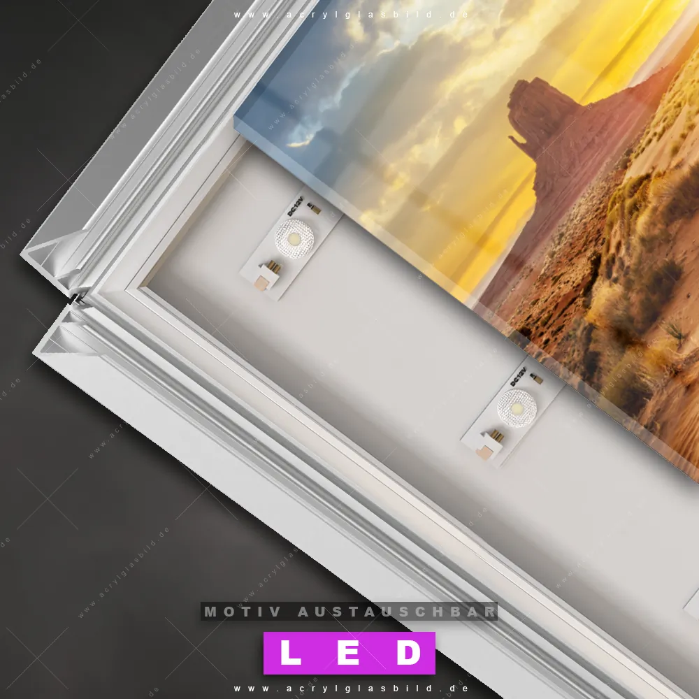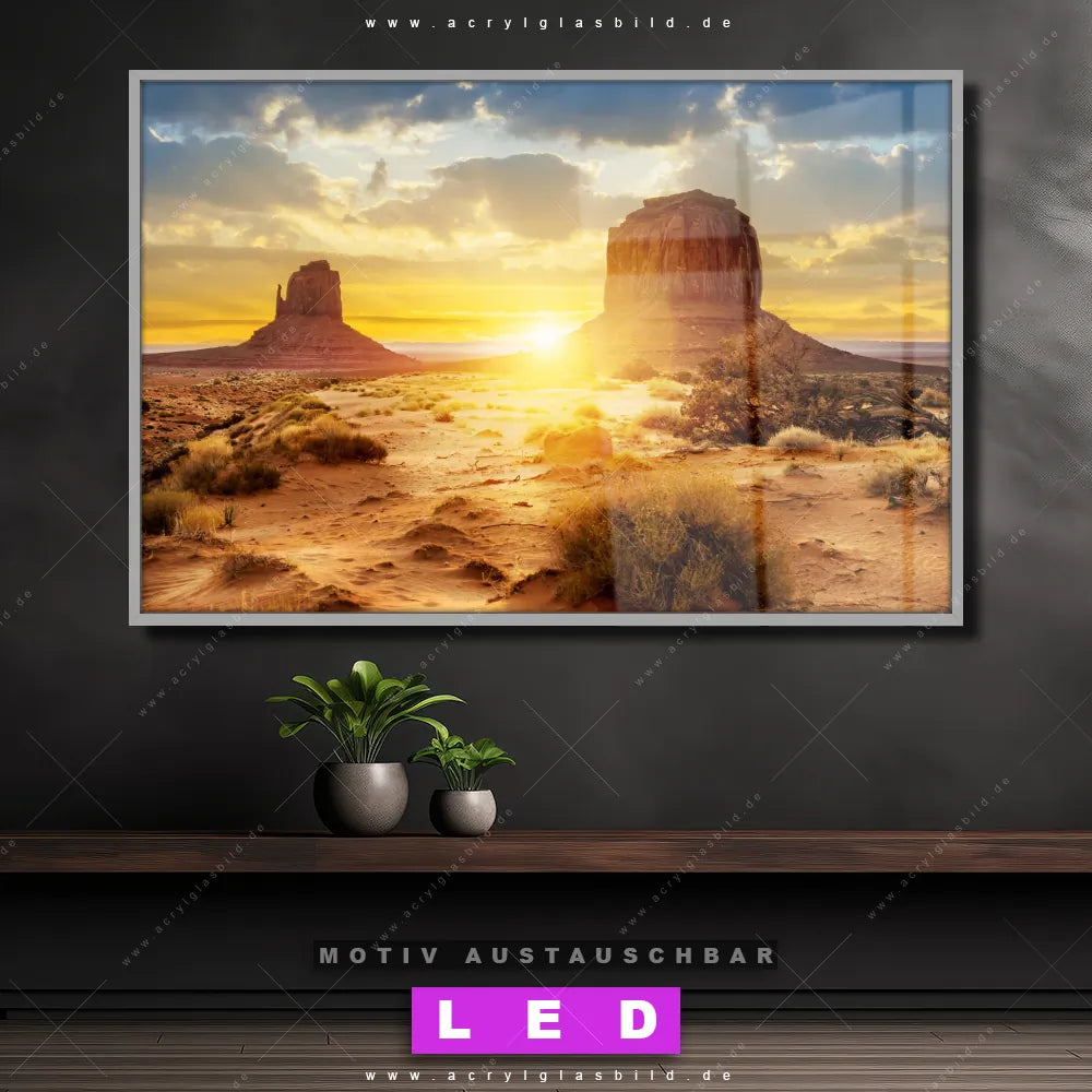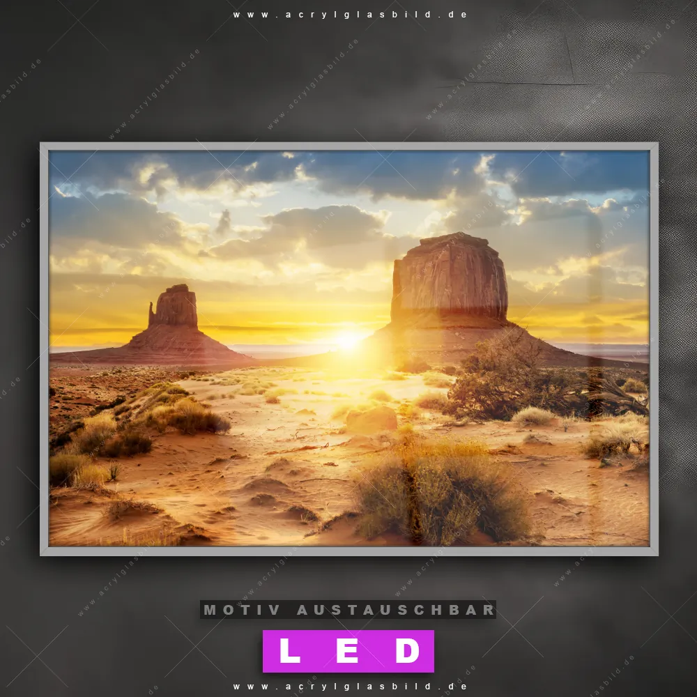 Mit unserem LED Acrylglasbild Canvalight® DIA Monument Valley Felsen in der Abendsonne und seiner genialen LED-Ausleuchtung wirst du nie wieder im Dunkeln auf deinem Sofa herumtappen. Wenn du nach einem beleuchteten Wandbild aus Acrylglas mit Sehenswürdigkeit, USA, Landschaft, Sonnenuntergang, Steine, Felsen für Arzt - Praxis, Bar - Gastronomie, Büro - Kanzlei, Flur - Eingangsbereich, Wohnzimmer - Schlafzimmer suchst, ist unser LED Leuchtbild Felsen in Wüstenlandschaft bei Sonnenuntergang in den beeindruckenden Motiv-Farben Orange, Lila, Rosa, Blau, Grün, Gelb , Hellgrün, Hellblau genau das richtige beleuchtete Wandbild für dich. Gestaltet im Natürlich - Realistisch Stil, passt dieses LED Wandbild mit DIA-Klapprahmen und glänzender Front aus Acrylglas perfekt zu jedem Einrichtungsstil – sogar zu deinem chaotischen kreativen Durcheinander!