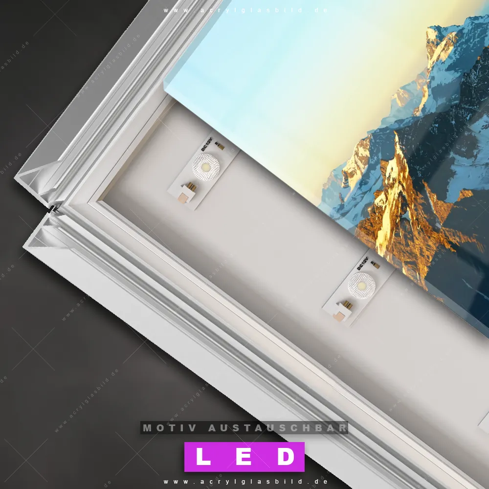 Also, worauf wartest du noch? Gib mit einem beleuchteten Wandbild mit wechselbarer Acrylglas-Scheibe deinen Wänden das gewisse Etwas und bestelle jetzt das LED Acrylglasbild Canvalight® DIA felsige Berge mit Schnee – dein Zuhause wird es dir danken und deine Freunde werden dank der wechselbaren Motive erblassen!