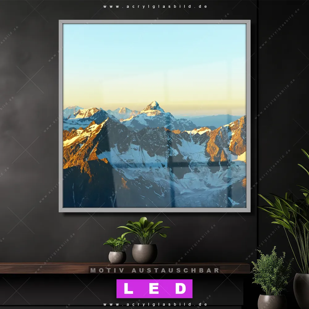 Bist du bereit, deine Wände mit einem dimmbaren LED Bild mit Fernbedienung und optionaler Farbtemperatursteuerung zum Leuchten zu bringen? Wir haben das ultimative Landschaften LED Acrylglasbild Canvalight® DIA für dich! Unser LED Wandbild aus Acrylglas Gipfel in den Alpen im Quadratischen Format mit austauschbarer bedruckter Acrylglas-Scheibe im DIA-Klapprahmen bringt sofort jede Menge Glanz in deine vier Wände.