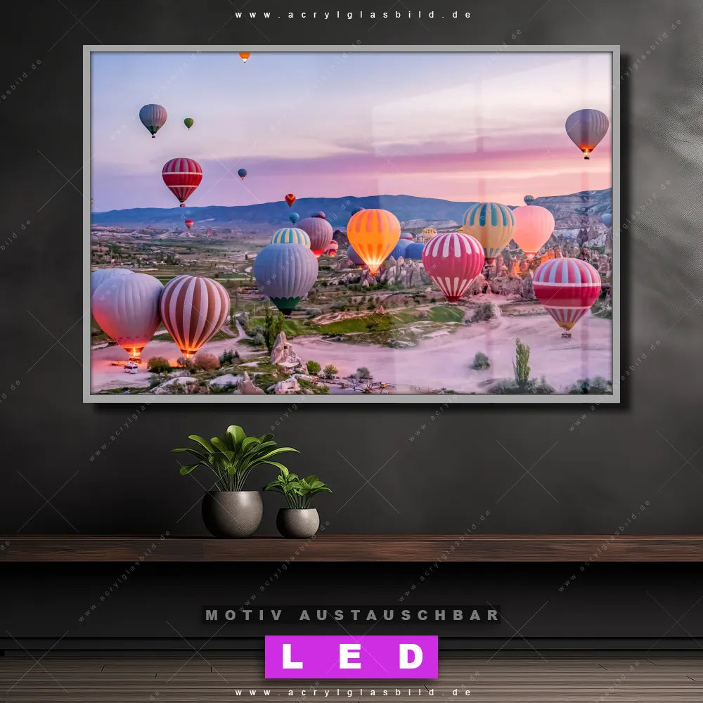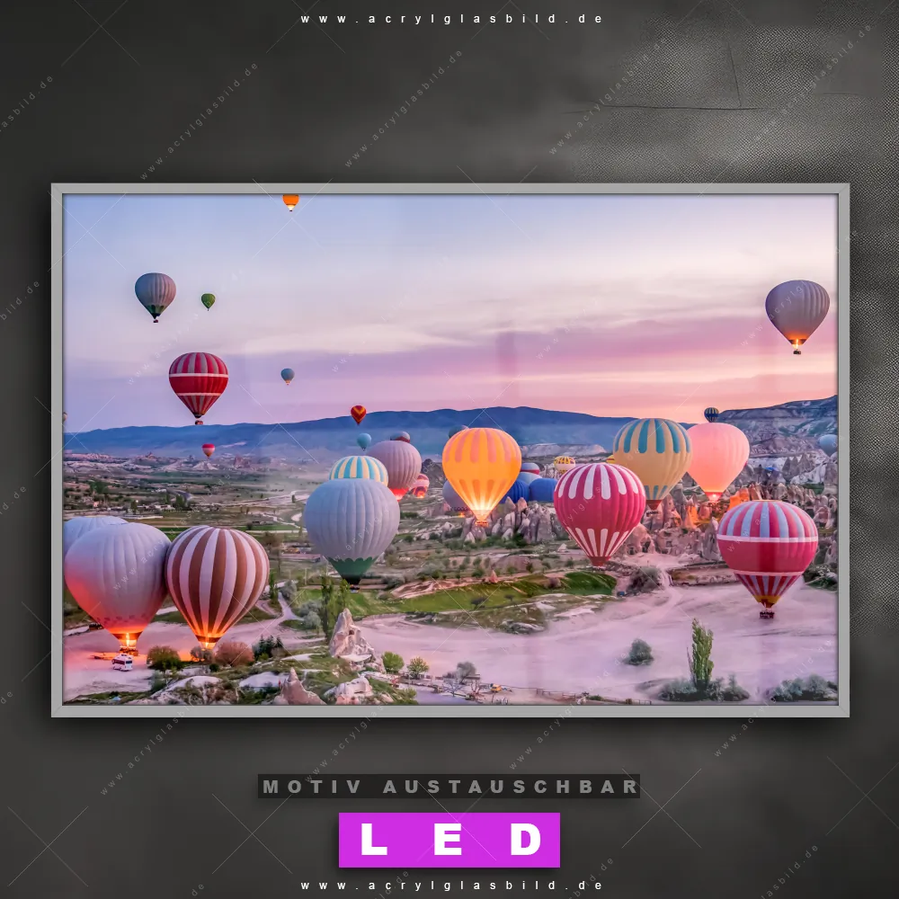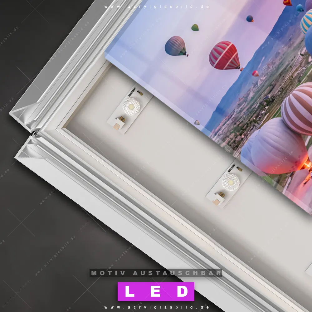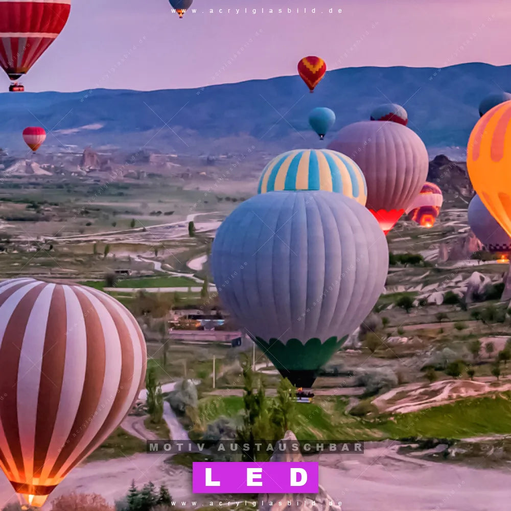 Du bist auf der Suche nach einem dimmbaren Landschaften LED Bild mit Fernbedienung und optionaler Farbtemperatursteuerung? Dann haben wir hier genau das richtige Wandbild mit LED Beleuchtung für dich: Unser Canvalight® DIA LED Acrylglasbild Heißluftballons im Sonnenuntergang im Querformat mit austauschbarer bedruckter Acrylglas-Scheibe. Dieses Leuchtbild bringt sofort Partybeleuchtung in deine Räume!