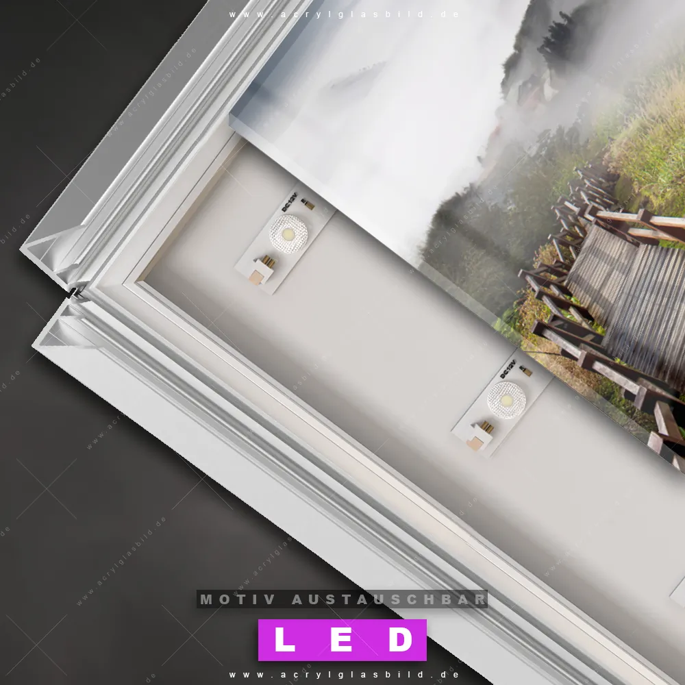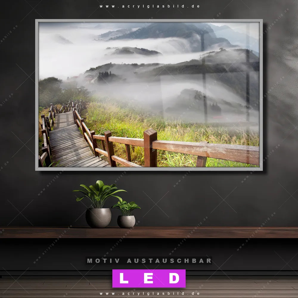 Du bist auf der Suche nach einem dimmbaren Landschaften LED Bild mit Fernbedienung und optionaler Farbtemperatursteuerung? Dann haben wir hier genau das richtige Wandbild mit LED Beleuchtung für dich: Unser Canvalight® DIA LED Acrylglasbild Holztreppe auf Berg mit Wolken im Querformat mit austauschbarer bedruckter Acrylglas-Scheibe. Dieses Leuchtbild bringt sofort Partybeleuchtung in deine Räume!