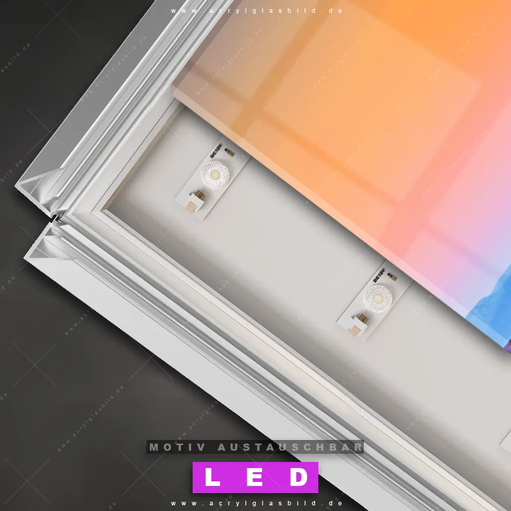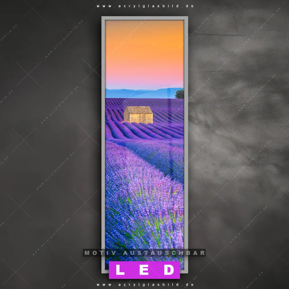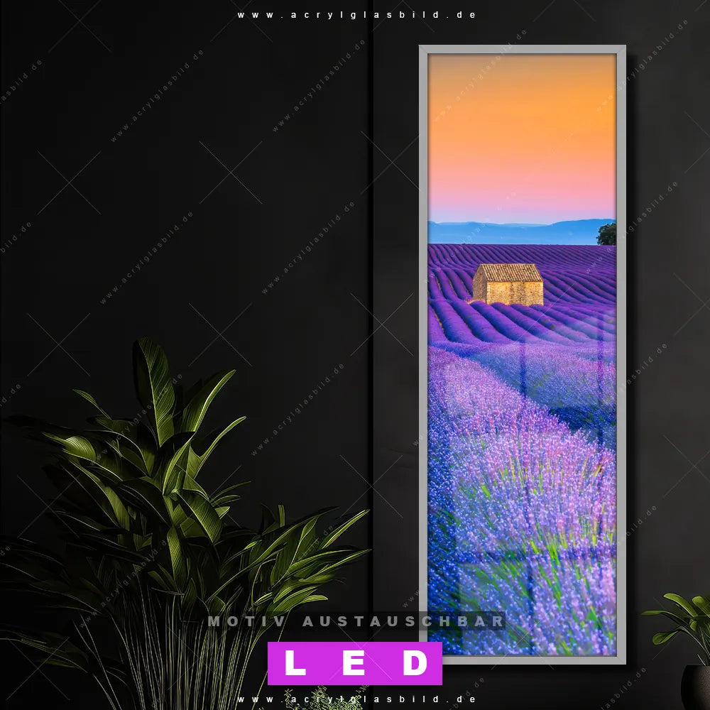 Bist du bereit, deine Wände mit einem dimmbaren LED Bild mit Fernbedienung und optionaler Farbtemperatursteuerung auf das nächste Level zu bringen? Unser Landschaften Canvalight® DIA LED Acrylglasbild ist genau das, was du brauchst! Das Wandbild mit LED Beleuchtung im Schmalen Format mit austauschbarer bedruckter Acrylglas-Scheibe Lavendel Blumen Feld bringt Licht und Stil in dein Zuhause – und das in null Komma nichts!