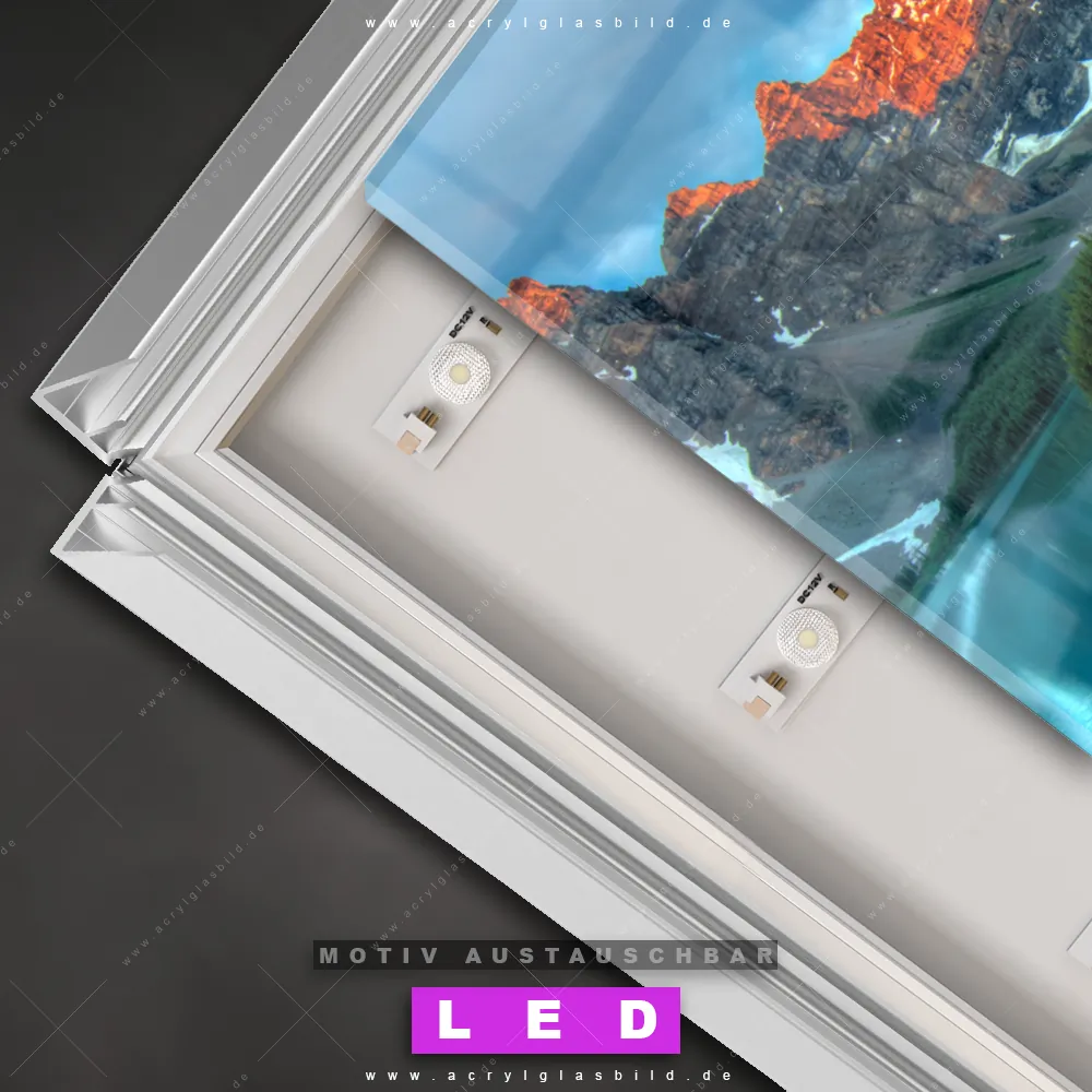 Du suchst nach einem Wandbild mit LED Beleuchtung als ultimativen Hingucker für deine Wände? Dann haben wir das perfekte dimmbare LED Bild mit Fernbedienung und optionaler Farbtemperatursteuerung für dich: unser abgefahrenes Landschaften Canvalight® DIA LED Acrylglasbild! Mit dem LED Leuchtbild aus Acrylglas Moränensee Sonnenaufgang im Hochformat mit austauschbarer bedruckter Acrylglas-Scheibe bringst du nicht nur Licht, sondern auch ordentlich Stil in deine Bude.