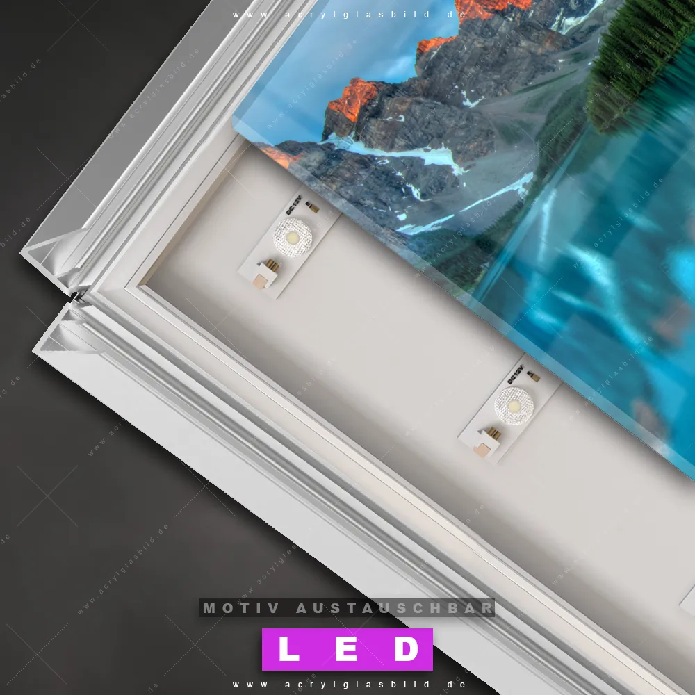 Also, worauf wartest du noch? Gib mit einem beleuchteten Wandbild mit wechselbarer Acrylglas-Scheibe deinen Wänden das gewisse Etwas und bestelle jetzt das LED Acrylglasbild Canvalight® DIA Farbenspiel am Bergsee – dein Zuhause wird es dir danken und deine Freunde werden dank der wechselbaren Motive erblassen!