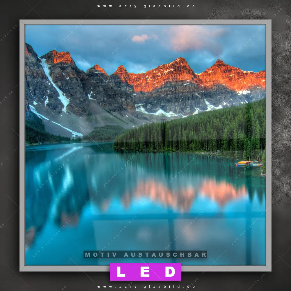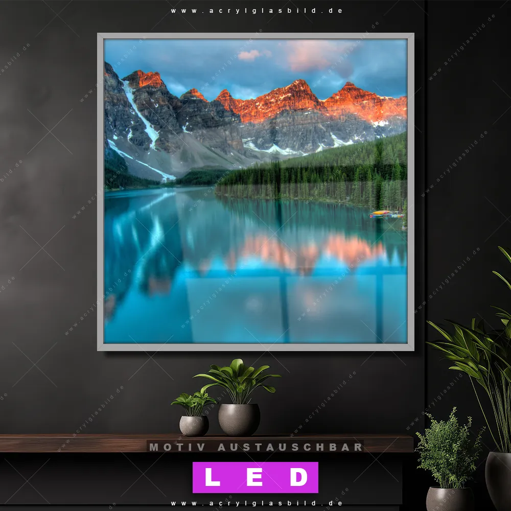 Bist du bereit, deine Wände mit einem dimmbaren LED Bild mit Fernbedienung und optionaler Farbtemperatursteuerung zum Leuchten zu bringen? Wir haben das ultimative Landschaften LED Acrylglasbild Canvalight® DIA für dich! Unser LED Wandbild aus Acrylglas Moränensee Sonnenaufgang im Quadratischen Format mit austauschbarer bedruckter Acrylglas-Scheibe im DIA-Klapprahmen bringt sofort jede Menge Glanz in deine vier Wände.