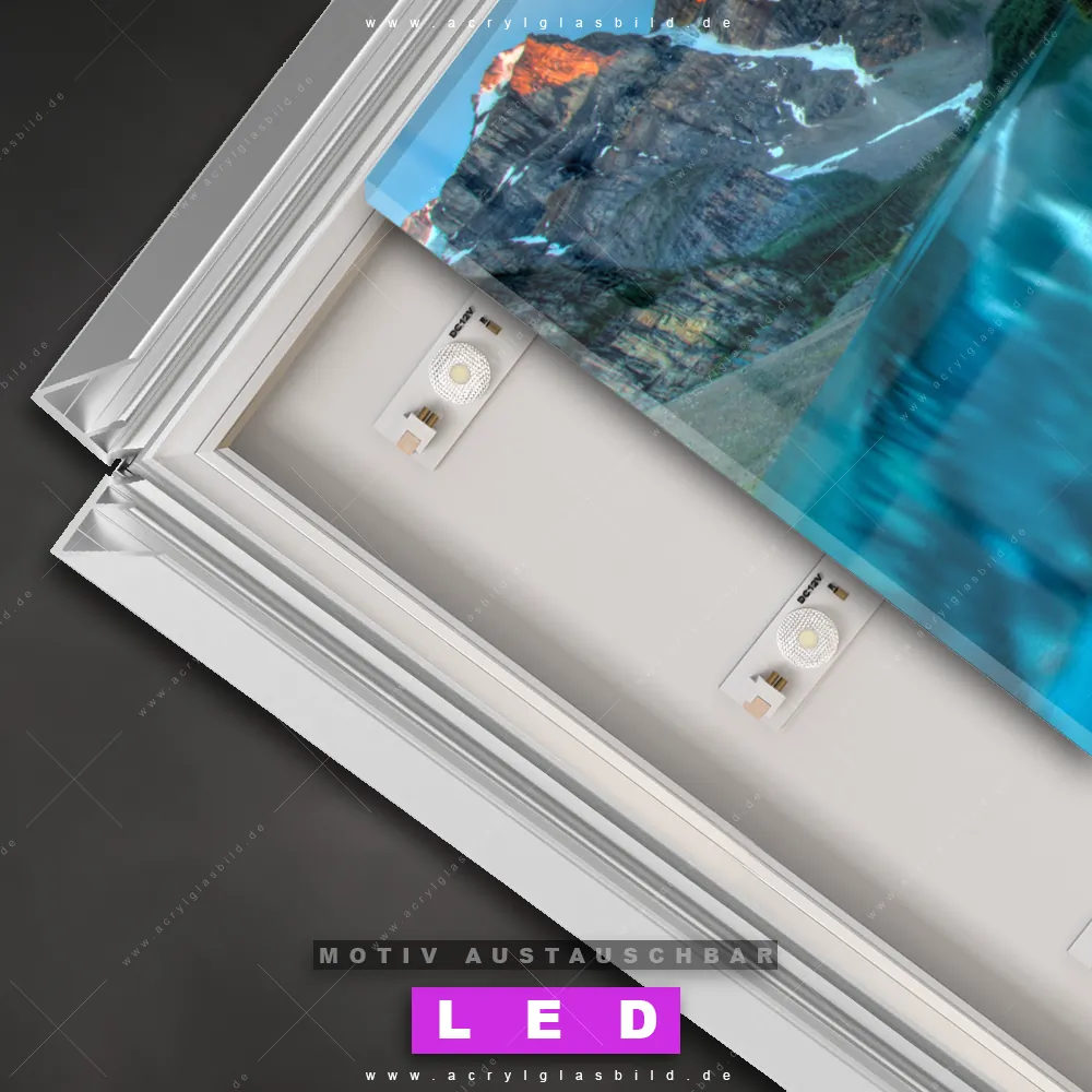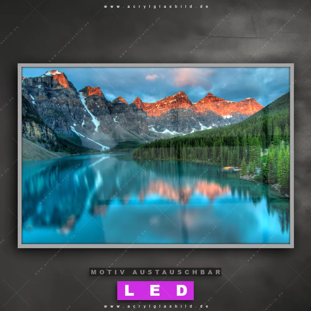 Du bist auf der Suche nach einem dimmbaren Landschaften LED Bild mit Fernbedienung und optionaler Farbtemperatursteuerung? Dann haben wir hier genau das richtige Wandbild mit LED Beleuchtung für dich: Unser Canvalight® DIA LED Acrylglasbild Moränensee Sonnenaufgang im Querformat mit austauschbarer bedruckter Acrylglas-Scheibe. Dieses Leuchtbild bringt sofort Partybeleuchtung in deine Räume!