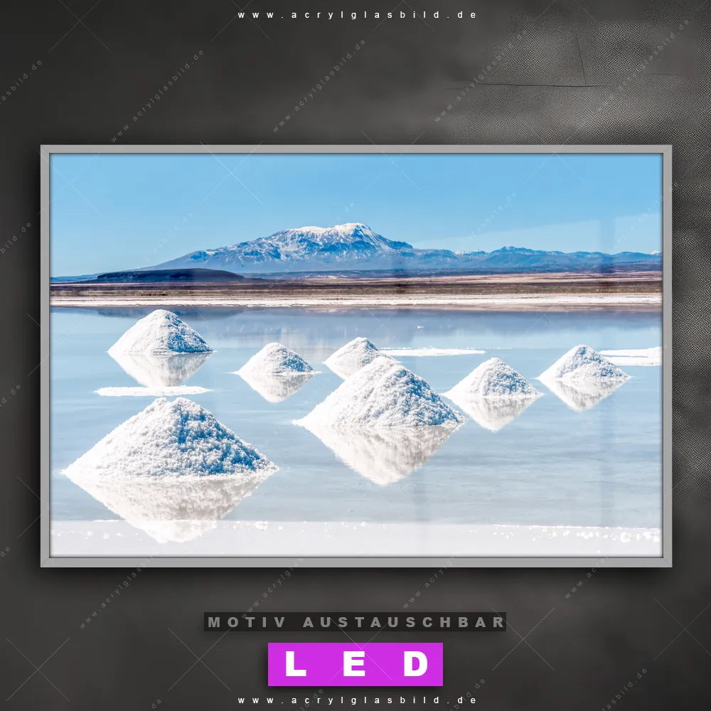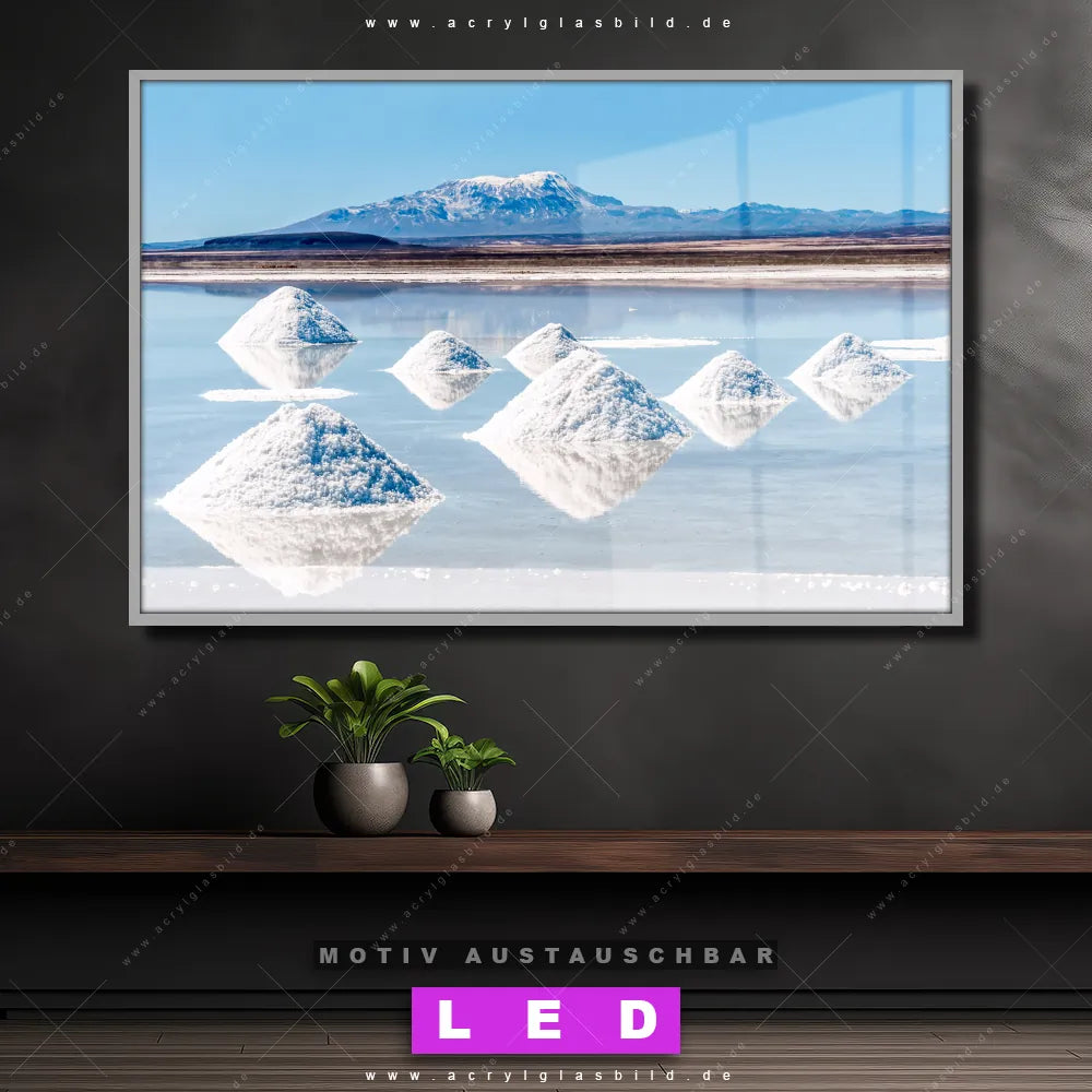 Mit unserem LED Acrylglasbild Canvalight® DIA Salzpyramiden vor Bergkulisse und seiner genialen LED-Ausleuchtung wirst du nie wieder im Dunkeln auf deinem Sofa herumtappen. Wenn du nach einem beleuchteten Wandbild aus Acrylglas mit Natur, Berge, See, Himmel, Südamerika, Bolivien, Spiegelung, Wasser, Wasserspiegelung für Arzt - Praxis, Büro - Kanzlei, Flur - Eingangsbereich, Wohnzimmer - Schlafzimmer suchst, ist unser LED Leuchtbild Weiße Pyramiden der Anden in den beeindruckenden Motiv-Farben Weiss, Blau, Hellblau genau das richtige beleuchtete Wandbild für dich. Gestaltet im Natürlich - Realistisch Stil, passt dieses LED Wandbild mit DIA-Klapprahmen und glänzender Front aus Acrylglas perfekt zu jedem Einrichtungsstil – sogar zu deinem chaotischen kreativen Durcheinander!