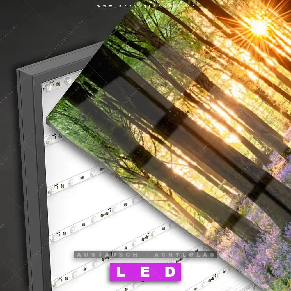 Begriffe wie Wald, Bäume, Blumen, Wiese, Sonnenaufgang, Sonne, Wandern, Frühling, Natur, Blüten haben dich auf der Suche nach deinem neuen Austausch-Acrylglasbild inspiriert? Dann sollte das Wechsel-Acrylglasbild Sonnenaufgang im Wald für dein bereits vorhandenes LED Acrylglasbild Canvalight® DIA den Weg zu dir finden.