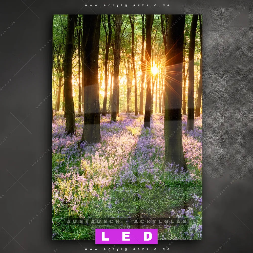Wechsel-Acrylglas Canvalight® DIA | Blühender Wald bei Sonnenaufgang | Hochformat