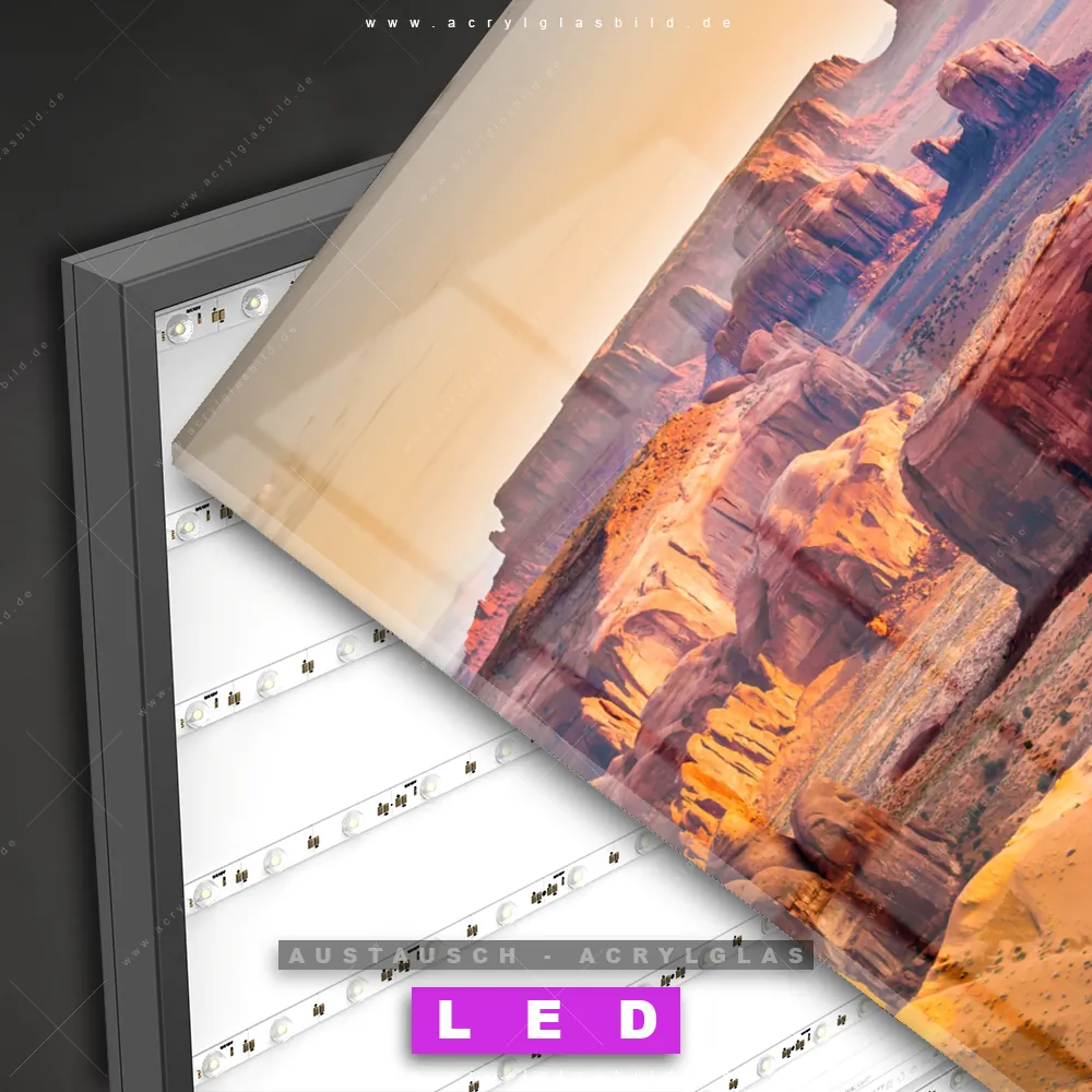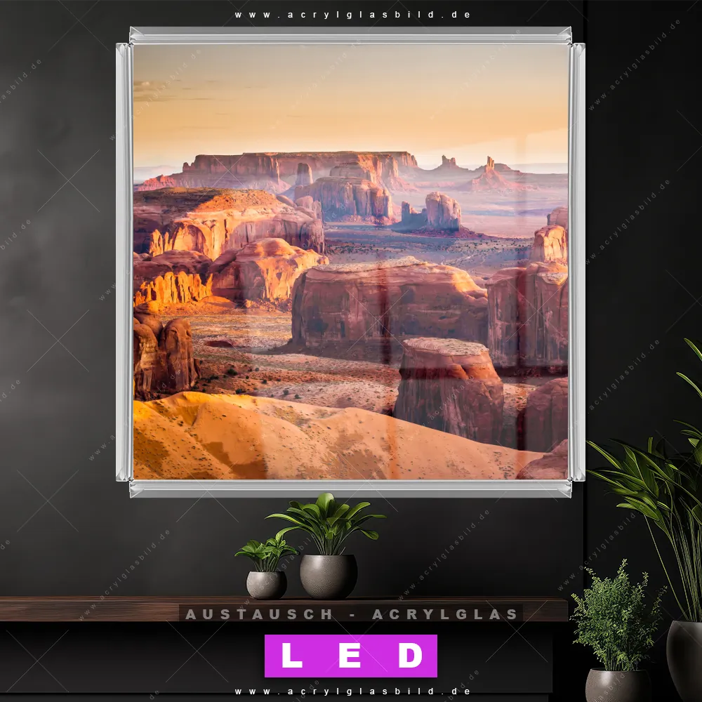 Begriffe wie Sehenswürdigkeit, USA, Landschaft, Sonnenuntergang, Steine haben dich auf der Suche nach deinem neuen Austausch-Acrylglasbild inspiriert? Dann sollte das Wechsel-Acrylglasbild Monument Valley Felsen in der Abendröte für dein bereits vorhandenes LED Acrylglasbild Canvalight® DIA den Weg zu dir finden.
