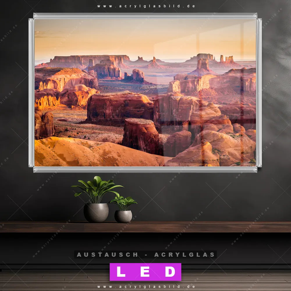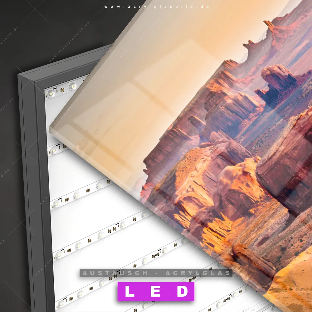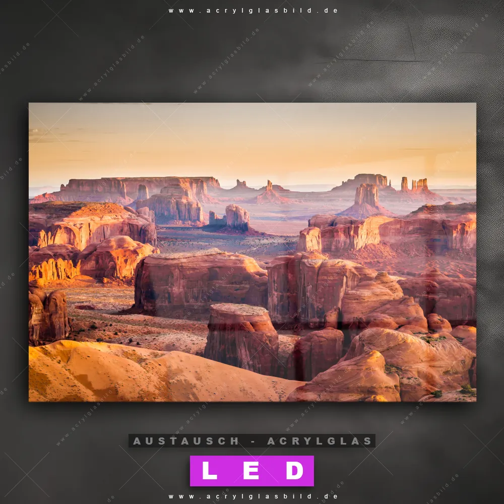 Begriffe wie Sehenswürdigkeit, USA, Landschaft, Sonnenuntergang, Steine haben dich auf der Suche nach deinem neuen Austausch-Acrylglasbild inspiriert? Dann sollte das Wechsel-Acrylglasbild Monument Valley Felsen in der Abendröte für dein bereits vorhandenes LED Acrylglasbild Canvalight® DIA den Weg zu dir finden.