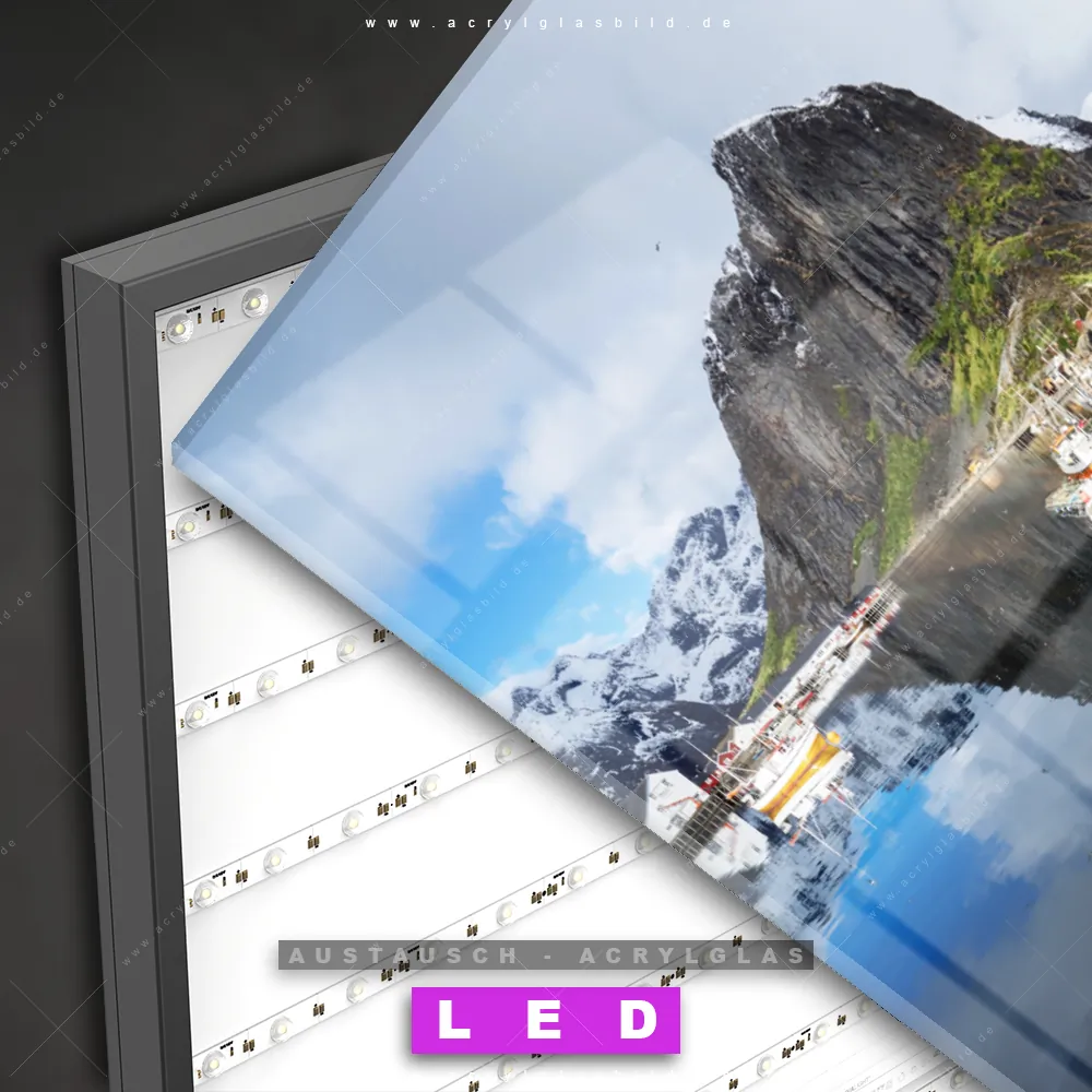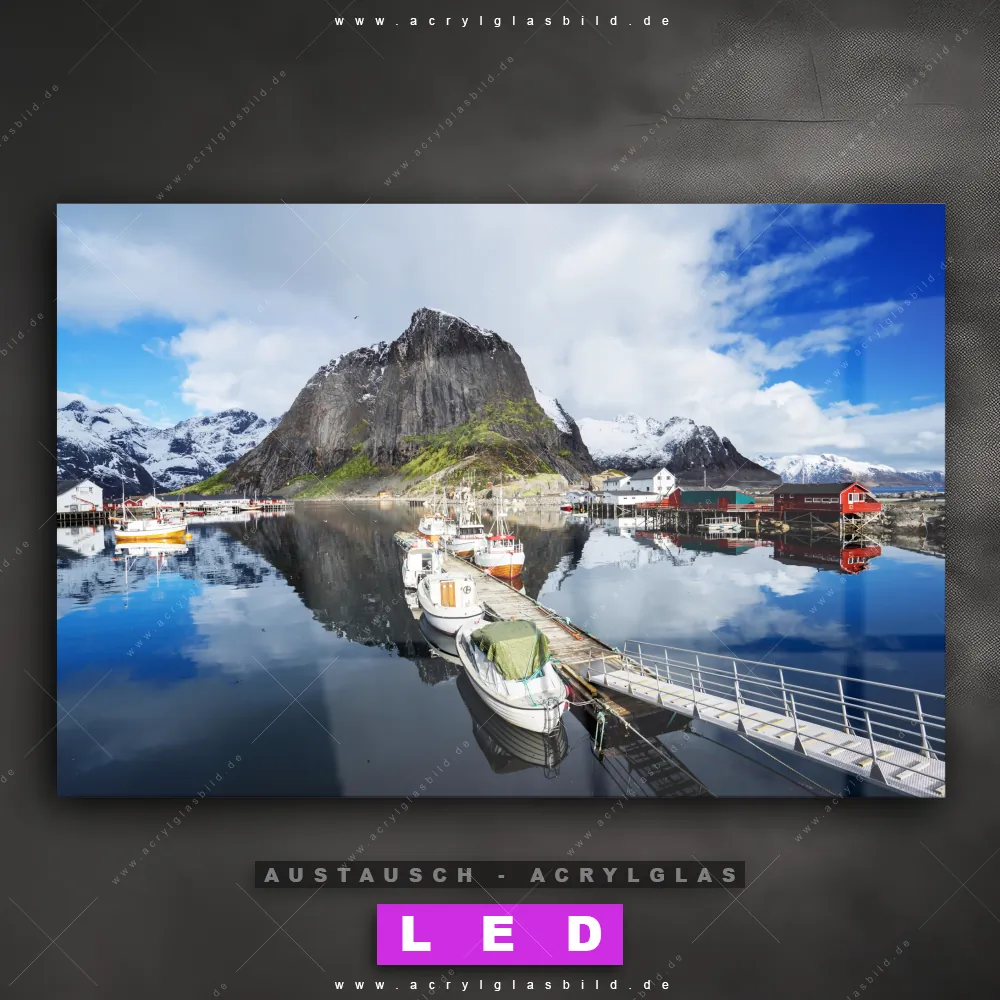 Begriffe wie Skandinavien, Norwegen, Haus, Boot, Berg, See, Frühling, Natur, Dorf, Steg haben dich auf der Suche nach deinem neuen Austausch-Acrylglasbild inspiriert? Dann sollte das Wechsel-Acrylglasbild Boote an skandinavischer Küste für dein bereits vorhandenes LED Acrylglasbild Canvalight® DIA den Weg zu dir finden.