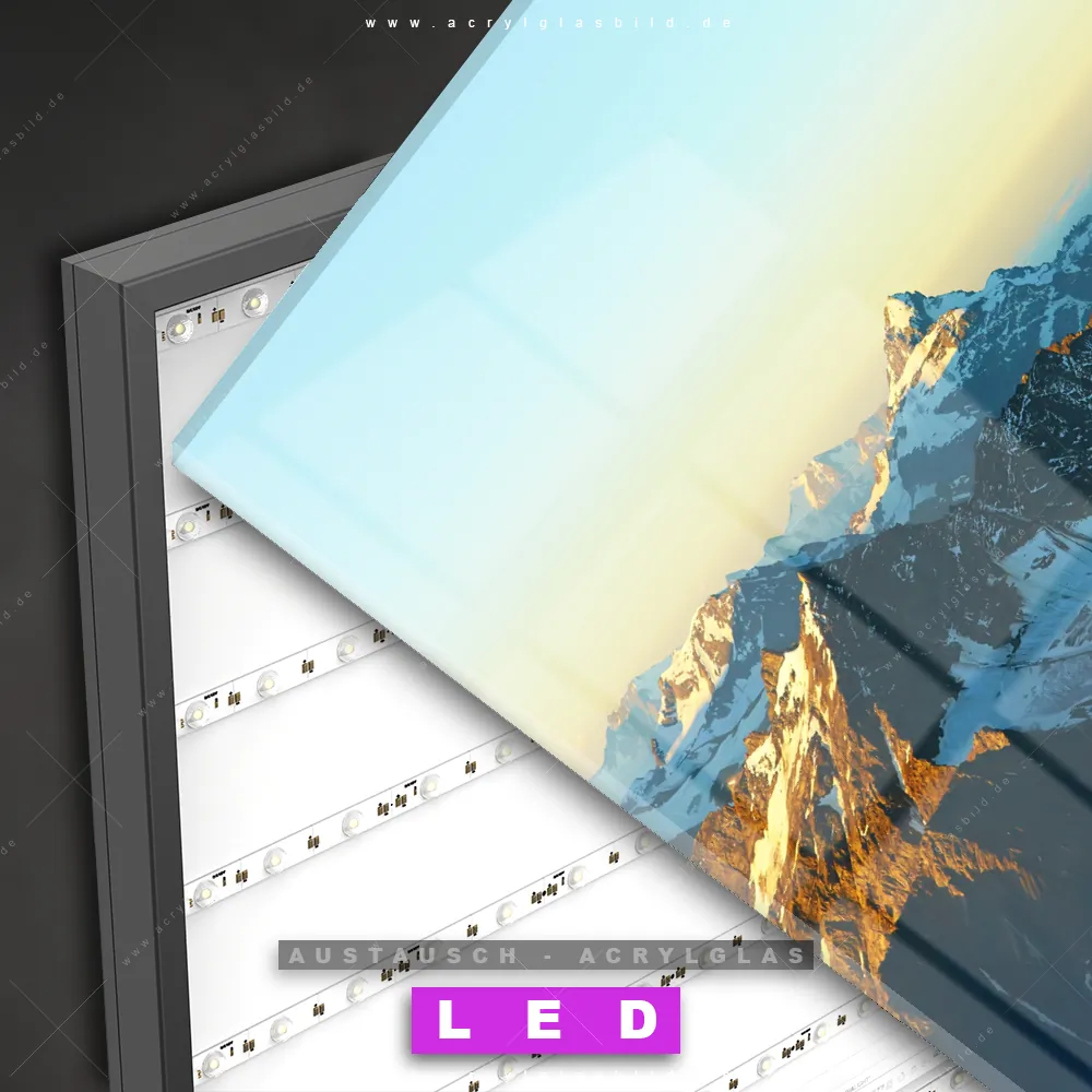 Begriffe wie Landschaft, Natur, Stille, Berge, Sonnenuntergang, Sonnenaufgang, Sonne, Gebirge, Nebel, Steine, Alpen haben dich auf der Suche nach deinem neuen Austausch-Acrylglasbild inspiriert? Dann sollte das Wechsel-Acrylglasbild Bergspitzen für dein bereits vorhandenes LED Acrylglasbild Canvalight® DIA den Weg zu dir finden.