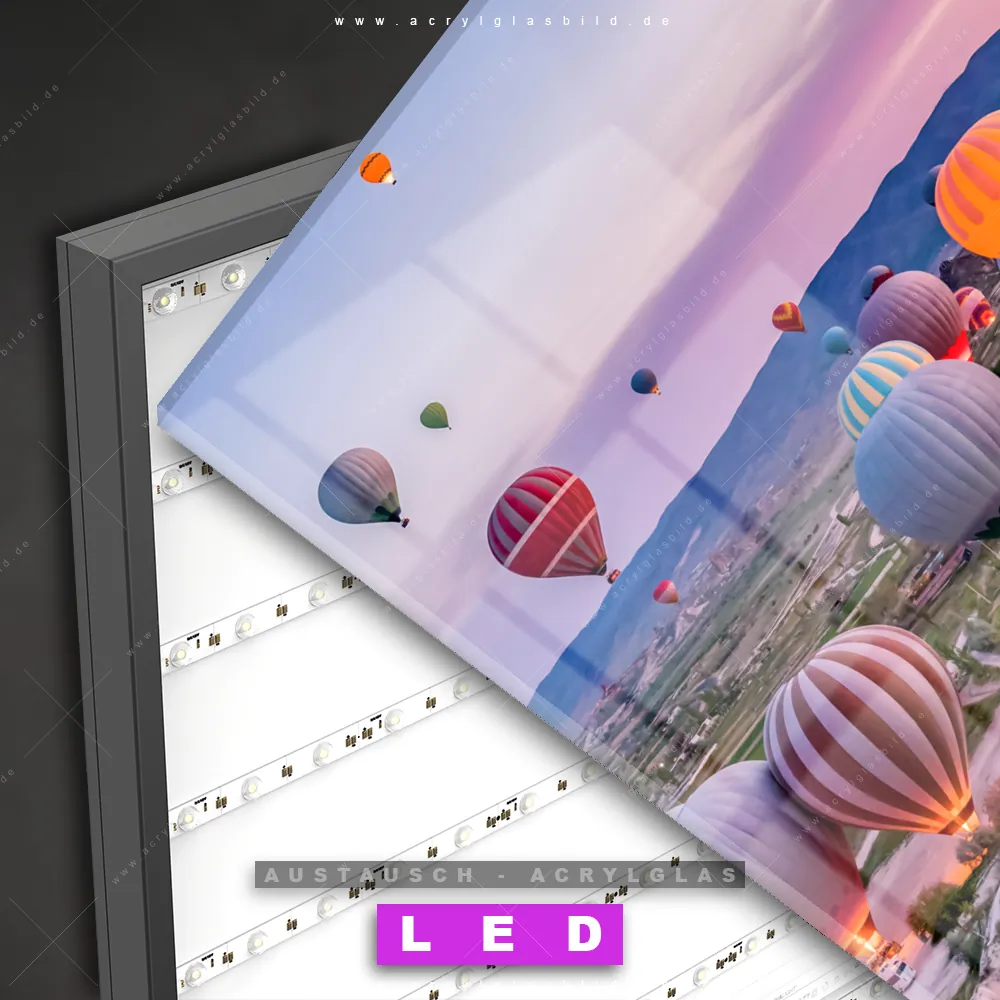 Begriffe wie Landschaft, Natur, Stille, Berge, Sonnenuntergang, Gebirge, Göreme-Nationalpark, Türkei haben dich auf der Suche nach deinem neuen Austausch-Acrylglasbild inspiriert? Dann sollte das Wechsel-Acrylglasbild bunte Heißluftballons für dein bereits vorhandenes LED Acrylglasbild Canvalight® DIA den Weg zu dir finden.