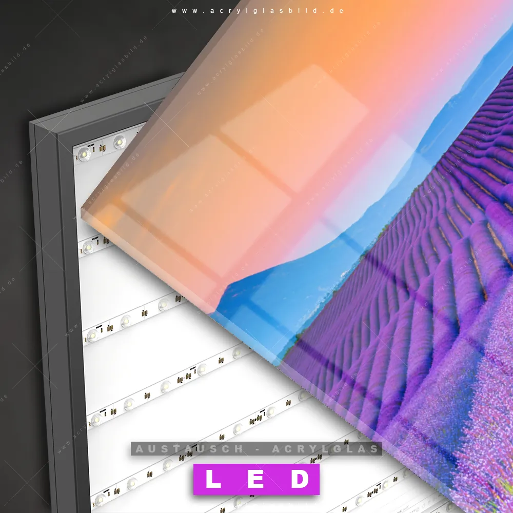 Begriffe wie Blumen, Lavendel, Baum, Feld, Sonnenuntergang, Wiese, Himmel haben dich auf der Suche nach deinem neuen Austausch-Acrylglasbild inspiriert? Dann sollte das Wechsel-Acrylglasbild Lavendelfeld für dein bereits vorhandenes LED Acrylglasbild Canvalight® DIA den Weg zu dir finden.