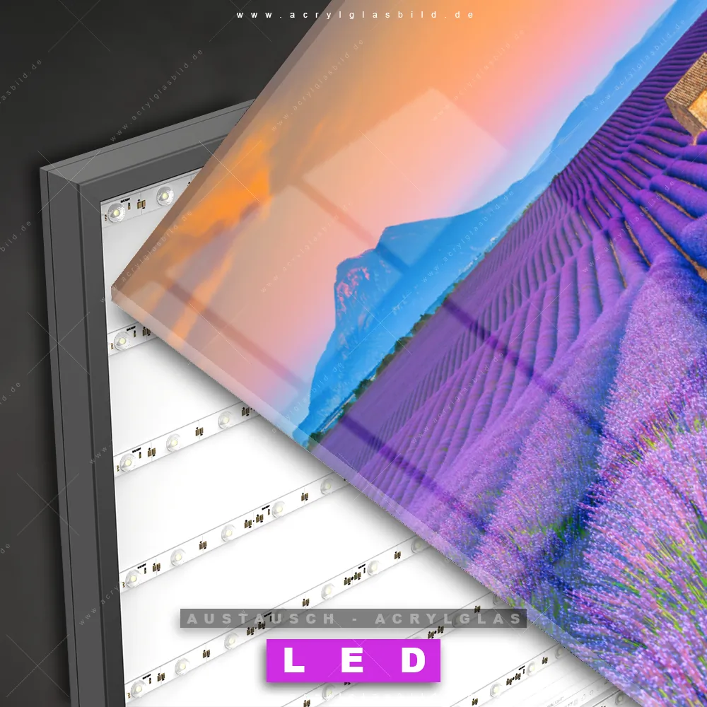 Begriffe wie Blumen, Lavendel, Baum, Feld, Sonnenuntergang, Wiese, Himmel haben dich auf der Suche nach deinem neuen Austausch-Acrylglasbild inspiriert? Dann sollte das Wechsel-Acrylglasbild Lavendelfeld für dein bereits vorhandenes LED Acrylglasbild Canvalight® DIA den Weg zu dir finden.