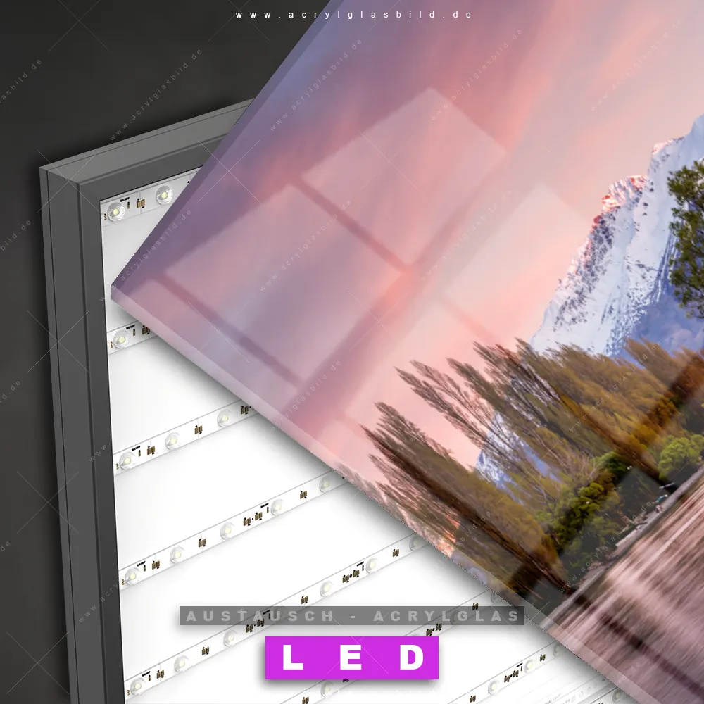 Begriffe wie Berge, See, Gebirge, Neuseeland, Sonnenaufgang, Morgenstunde, Baum, Schnee haben dich auf der Suche nach deinem neuen Austausch-Acrylglasbild inspiriert? Dann sollte das Wechsel-Acrylglasbild Sonnenaufgang am Wasser für dein bereits vorhandenes LED Acrylglasbild Canvalight® DIA den Weg zu dir finden.
