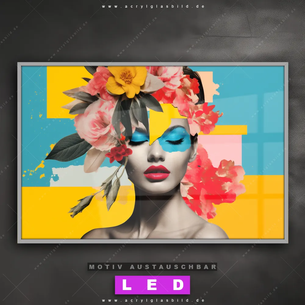 Mit unserem LED Acrylglasbild Canvalight® DIA Schöne Frau mit Blumen auf dem Haar und seiner genialen LED-Ausleuchtung wirst du nie wieder im Dunkeln auf deinem Sofa herumtappen. Wenn du nach einem beleuchteten Wandbild aus Acrylglas mit Menschen & Blumen, Frau, Porträt, Gesicht, Blumen, Blüten, Frisur, Haare, Schmetterlinge für Bar - Gastronomie, Friseur - Beauty, Wohnzimmer - Schlafzimmer, Flur - Eingangsbereich suchst, ist unser LED Leuchtbild Florales, Abstraktes Frauengesicht in den beeindruckenden Motiv-Farben Blau, Türkis, Rosa, Lila, Weiss genau das richtige beleuchtete Wandbild für dich. Gestaltet im Modern Art, Floral, Pop Art, Mixed Media Stil, passt dieses LED Wandbild mit DIA-Klapprahmen und glänzender Front aus Acrylglas perfekt zu jedem Einrichtungsstil – sogar zu deinem chaotischen kreativen Durcheinander!
